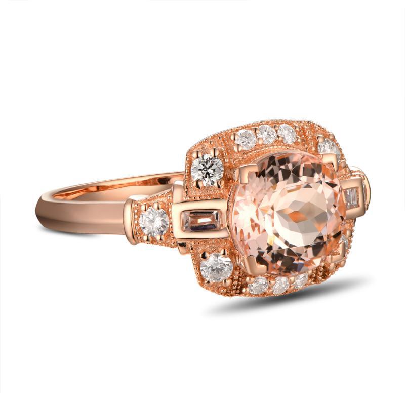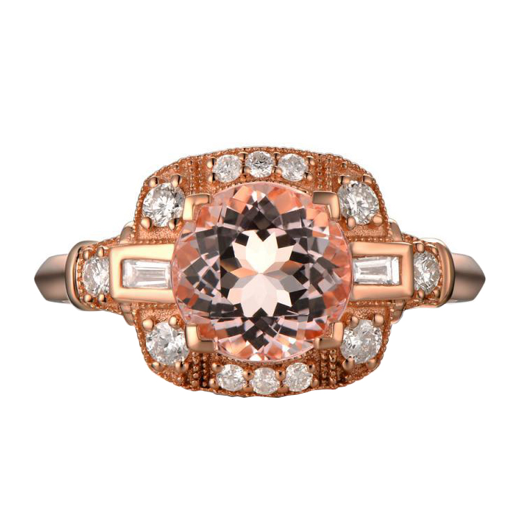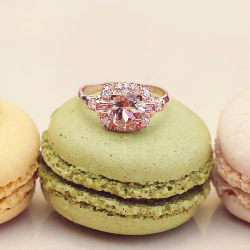 • ein aparter Ring mit einem diamantenbesetzten Halo um einen Morganit