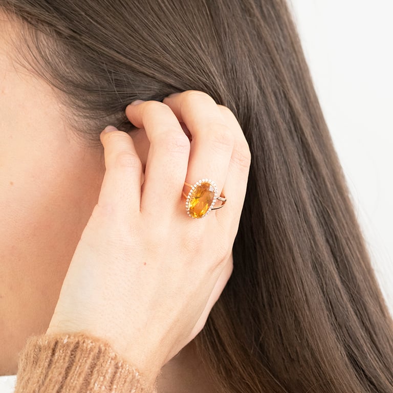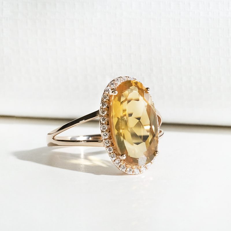 • Goldring mit einem goldgelben ovalen 5karätigen Citrin umsäumt von Diamanten