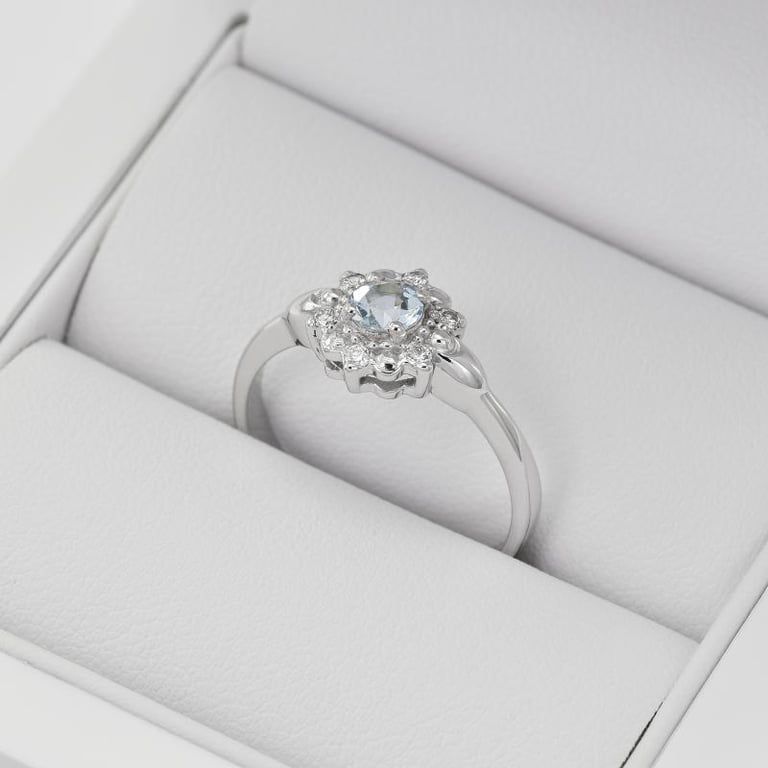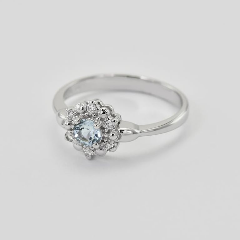 • in diesem Verlobungsring aus Weißgold strahlen klare Diamanten und ein Aquamarin um die Wette