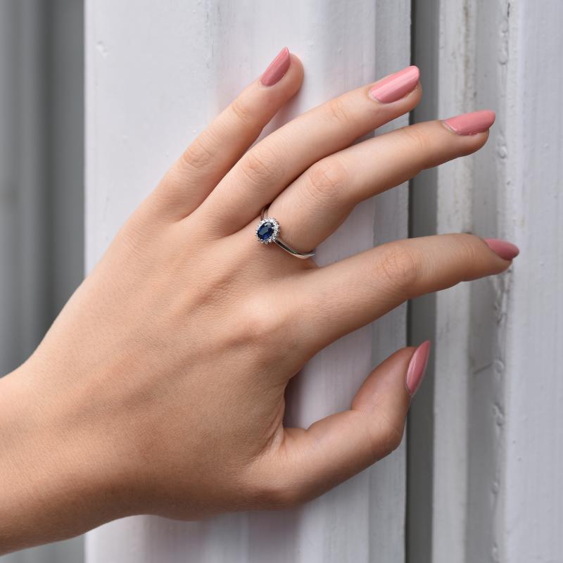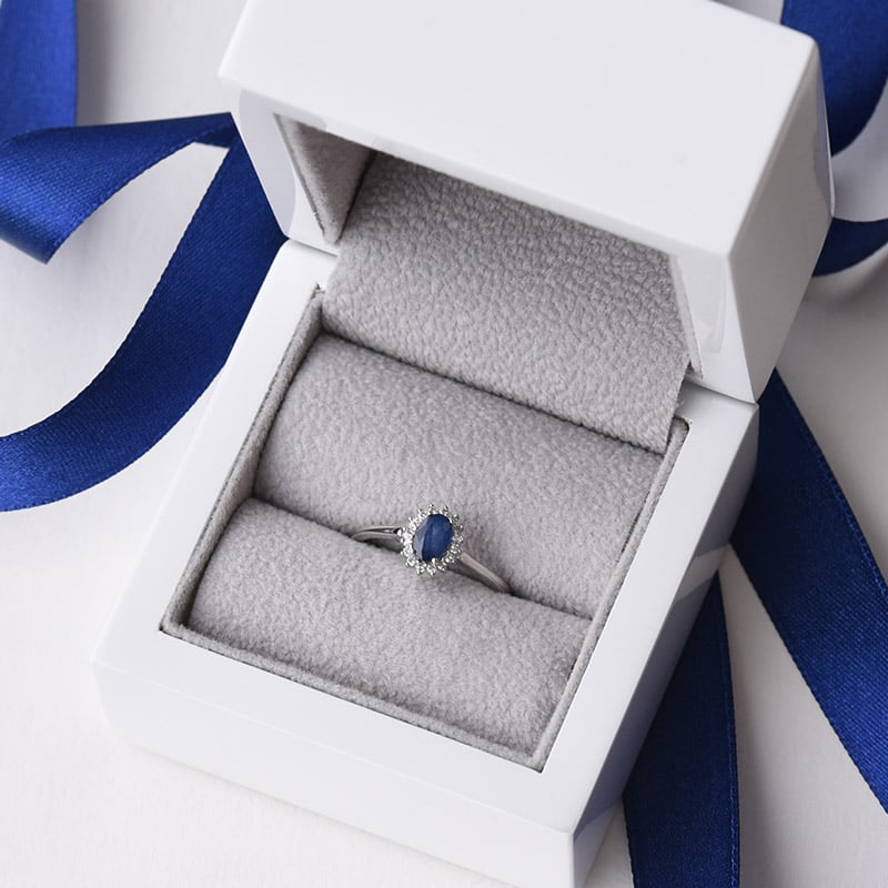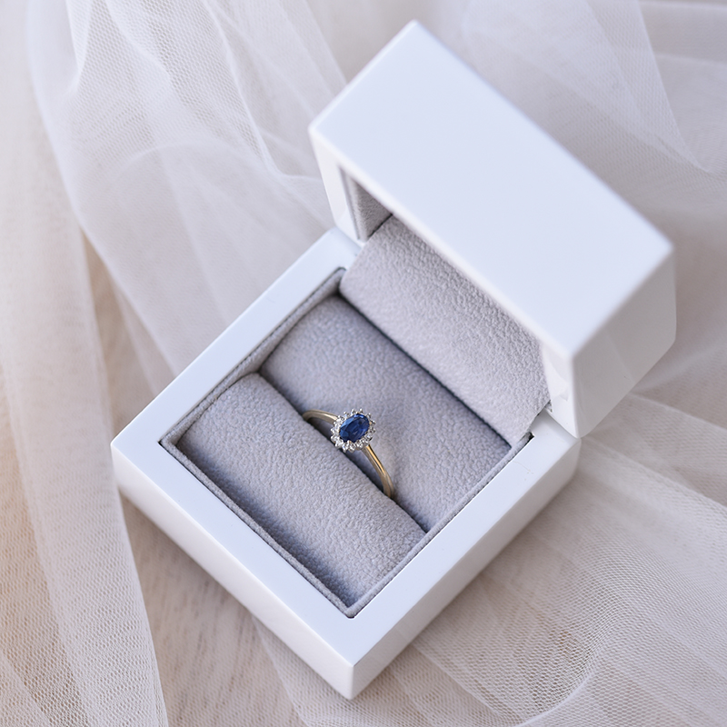 • ein goldener Ring mit ovalem Saphir und Diamanten
