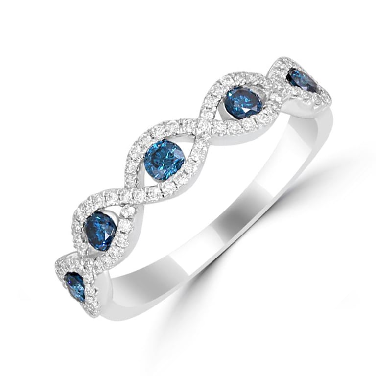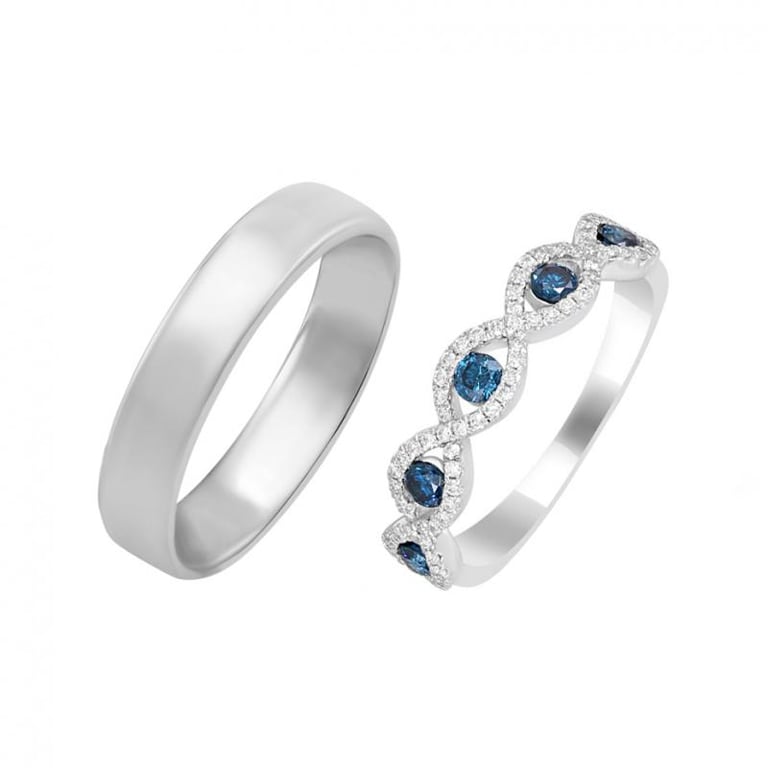 • ein zarter Ring mit blauen und weißen Diamanten und ein klassischer Ring mit gerader Form