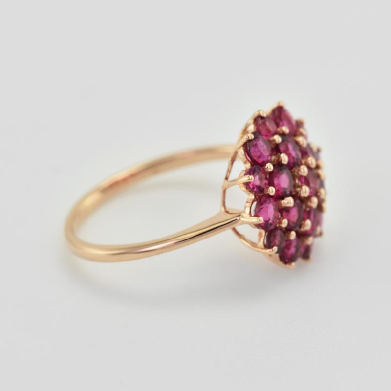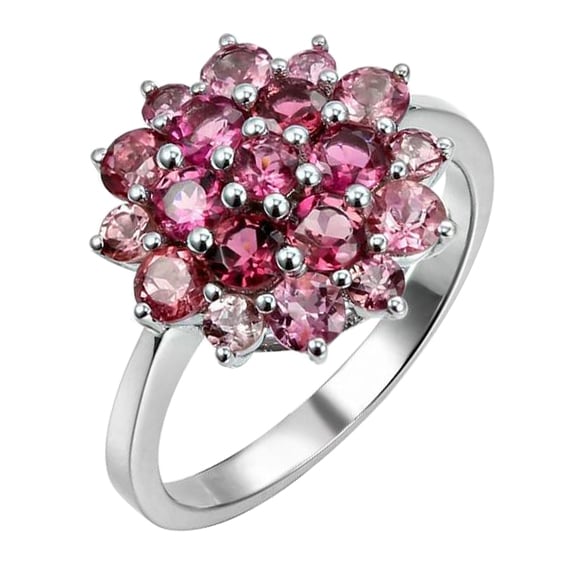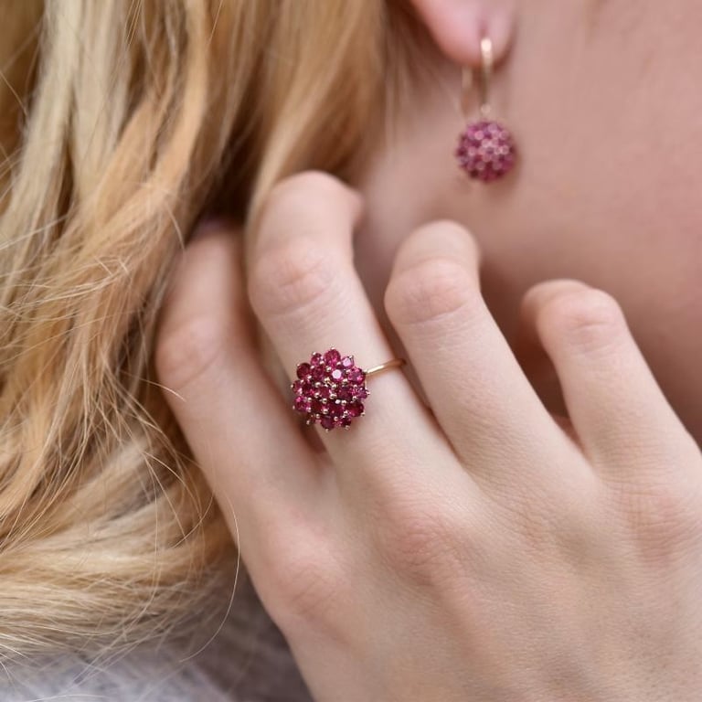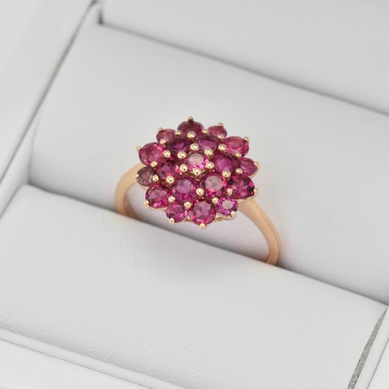 • eine aufgeblühte Rose aus dunkelrosa Turmalinen in Pavé-Fassung ziert diesen Ring
