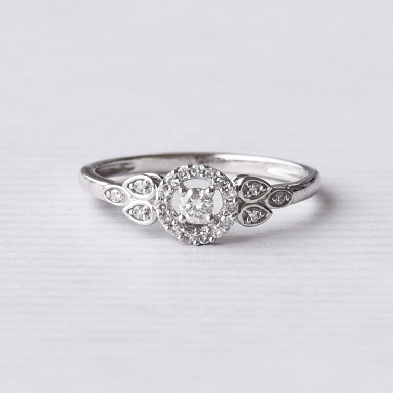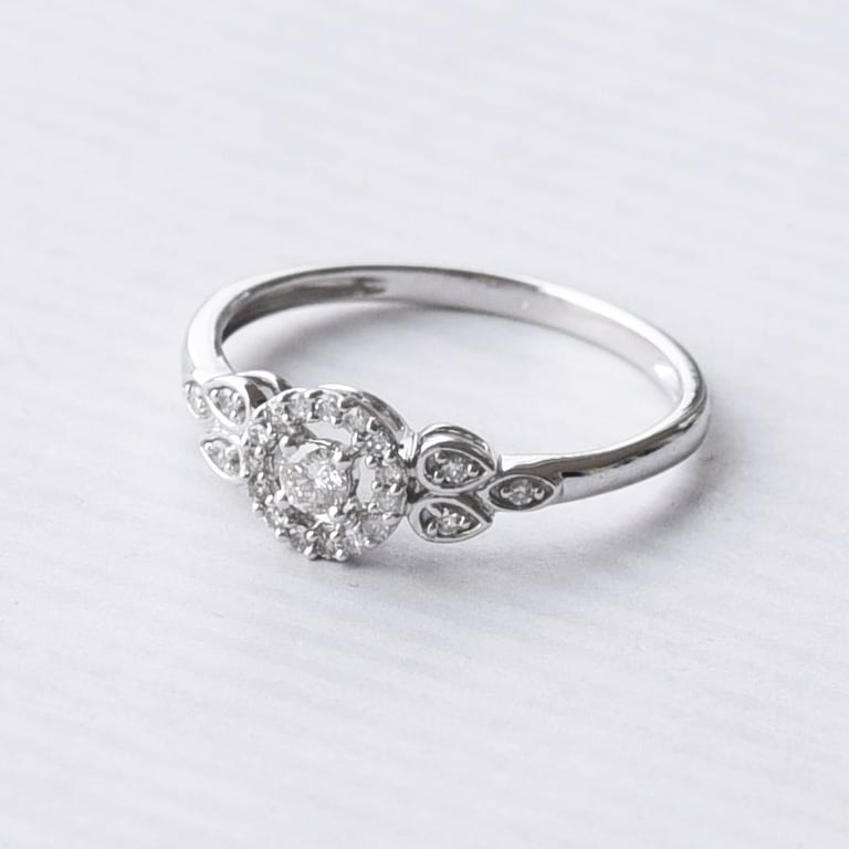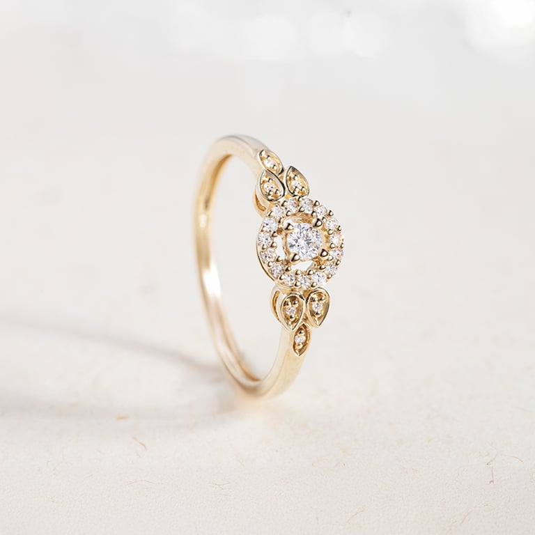 • diese Macht hat auch dieser Halo-Ring mit Diamanten aus Gold, der an eine Frühlingsblüte erinnert