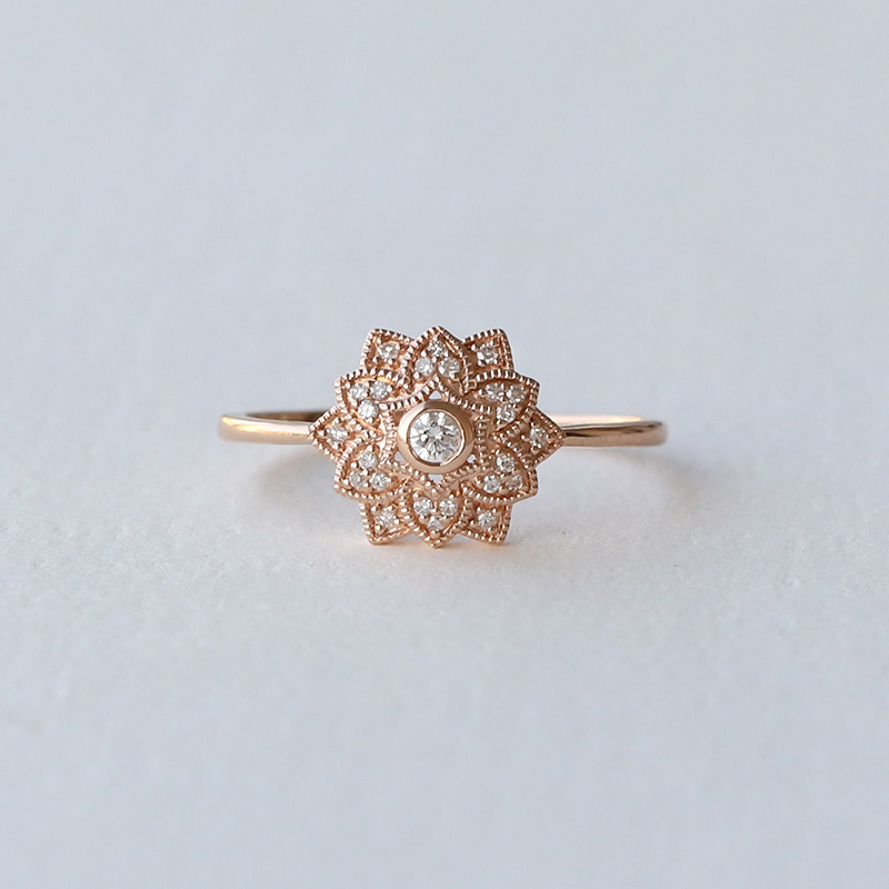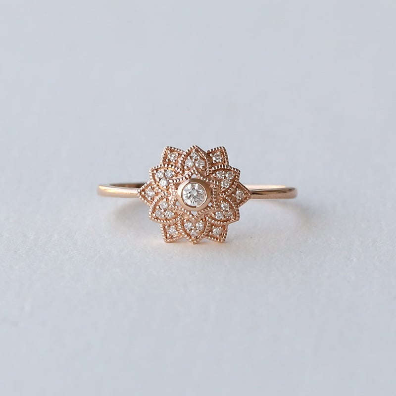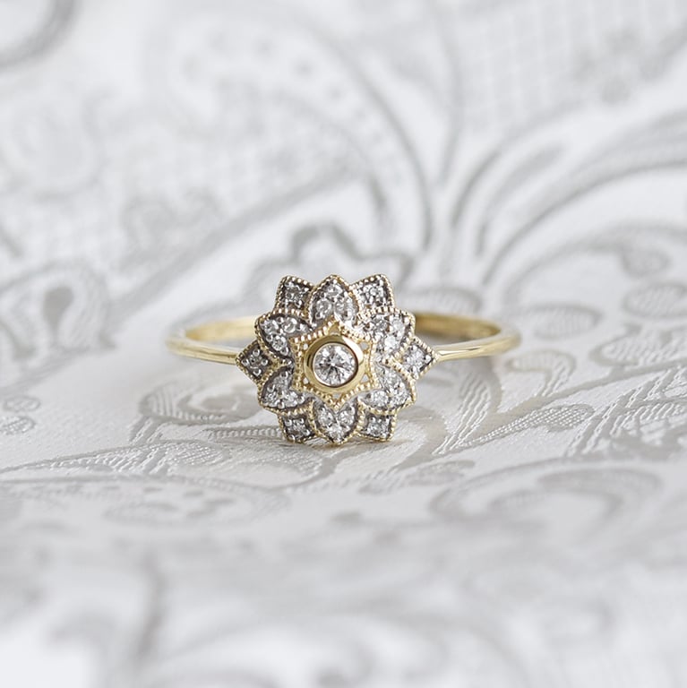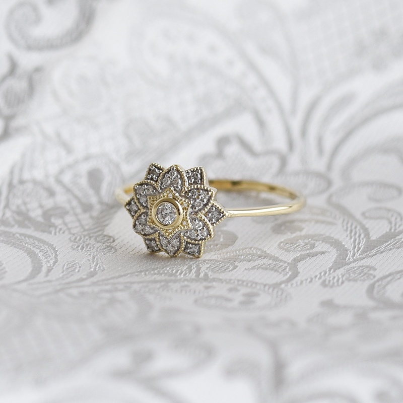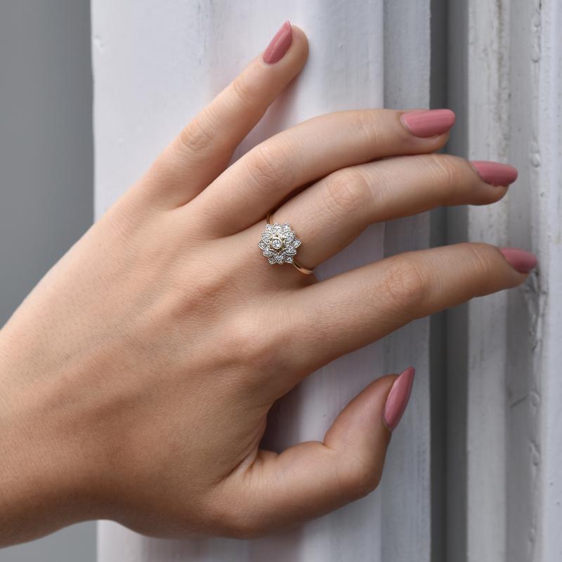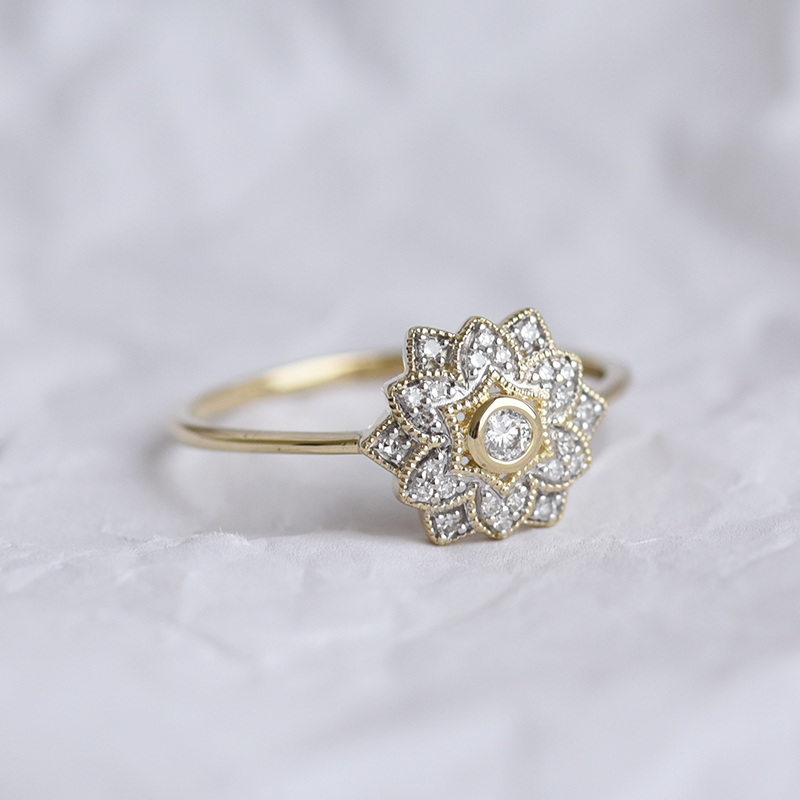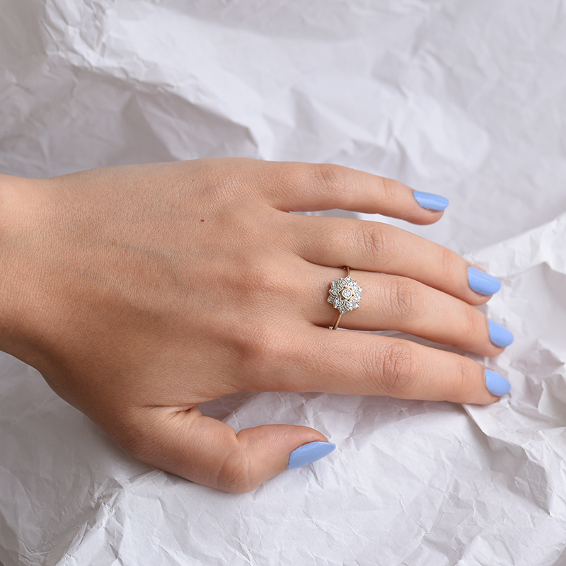 • dieser kunstvolle Ring verbindet die Wärme des Goldtons mit dem Funkeln und Strahlen von Diamanten in einer wunderschönen Blumenform