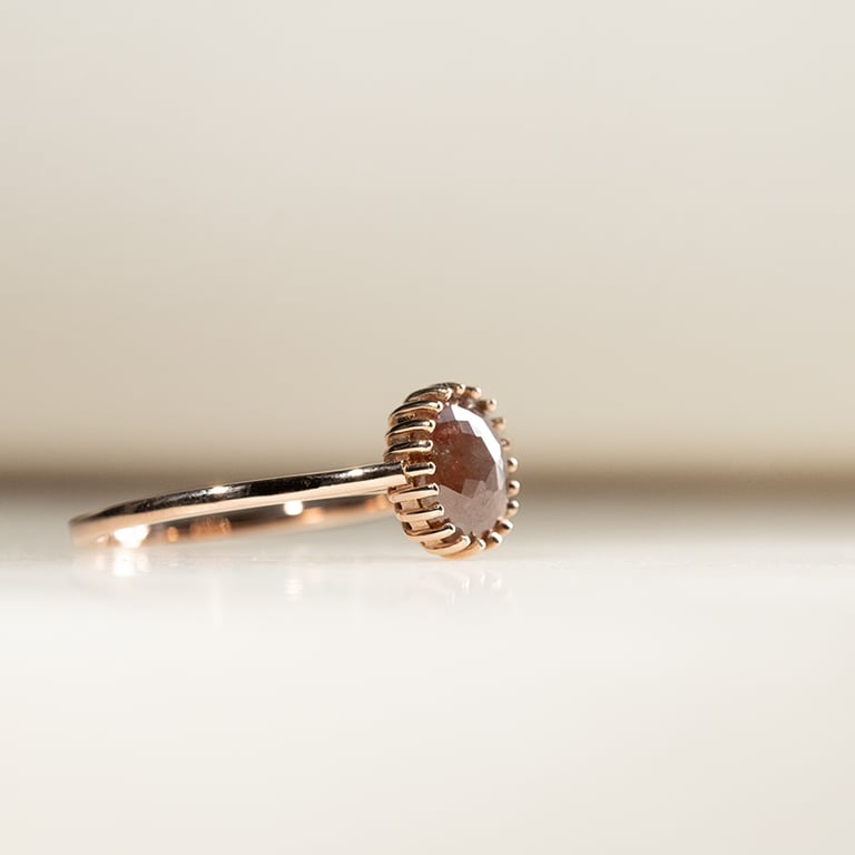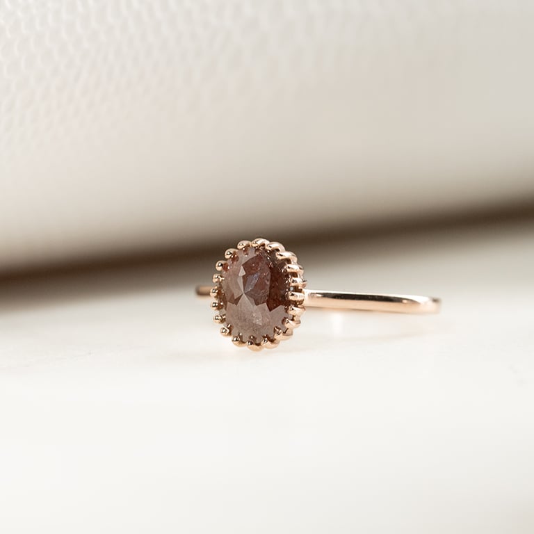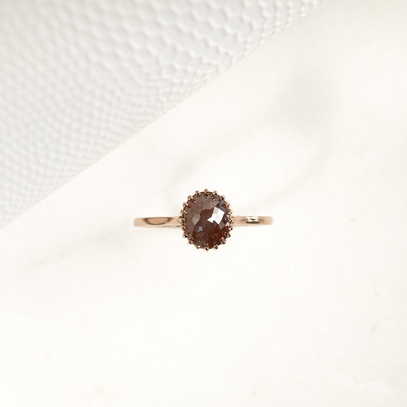 • den Ring ziert ein ovaler Salt and Pepper Diamant in einem raffinierten Braunton