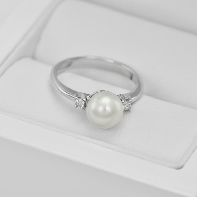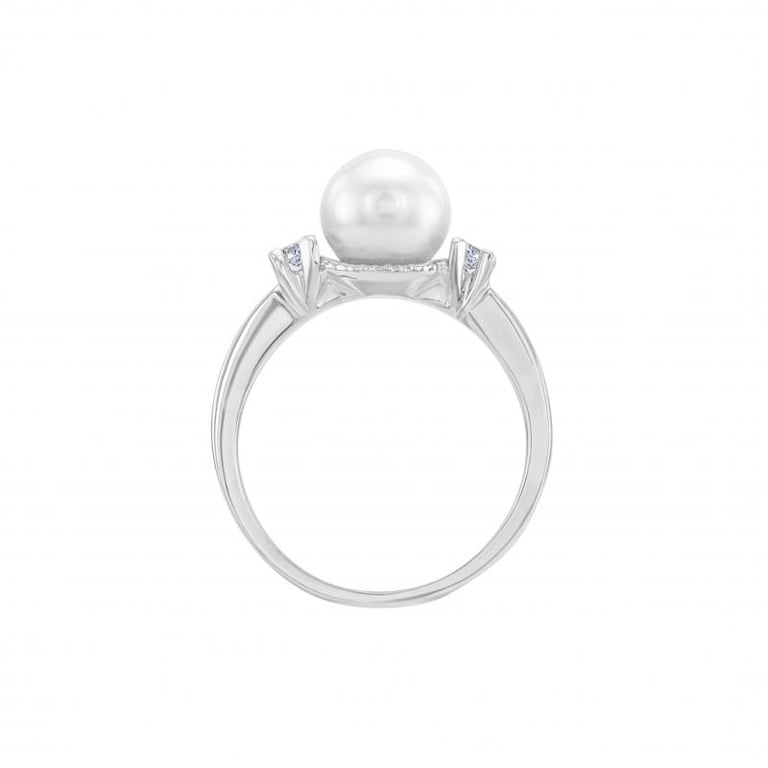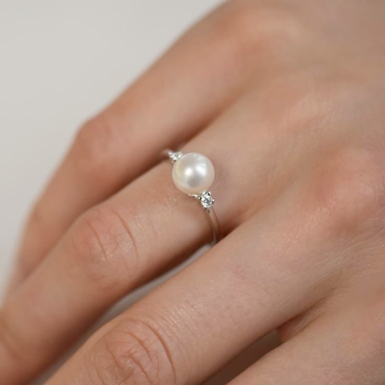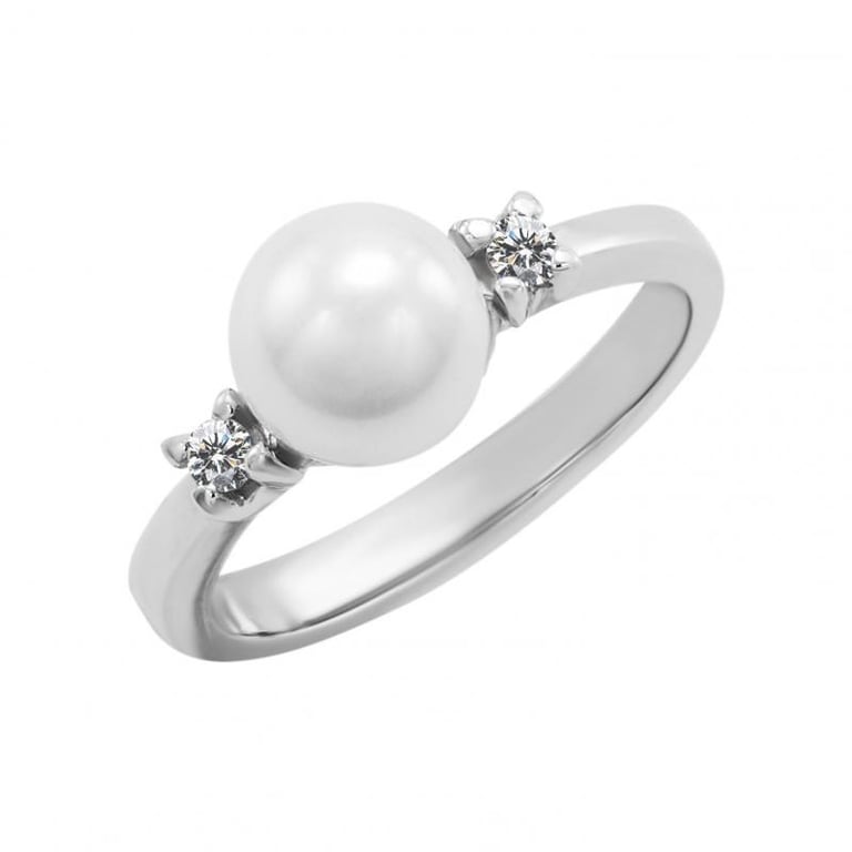 • der Ring in Weißgold hat eine sicher gefasste grosse Perle umgeben von zwei Diamanten