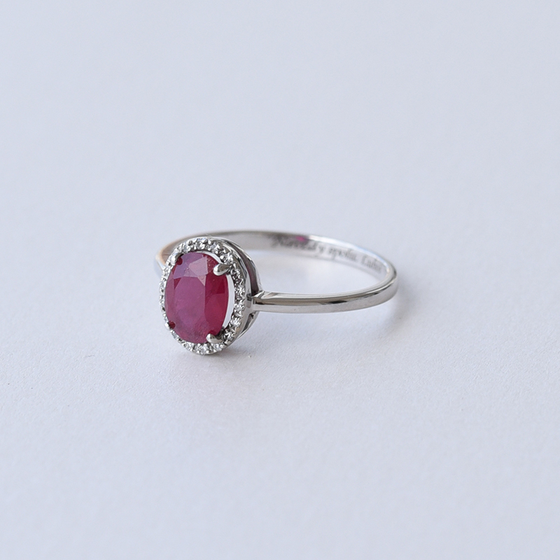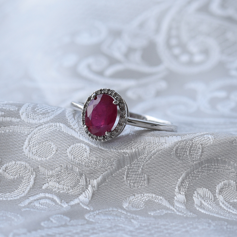 • achtzehn glänzende Diamanten umarmen den zentralen Rubin