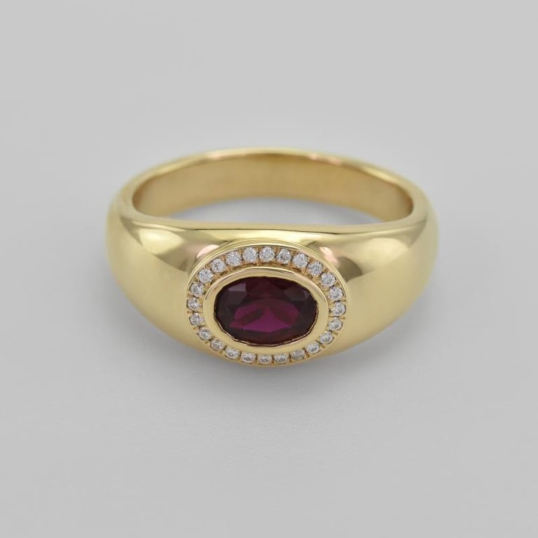 • massiver Goldring mit ovalem Rubin umgeben von Diamanten