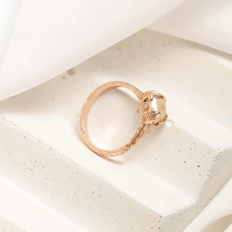 Goldring mit Salt and Pepper Diamant und handgravierten Blumen Flower
