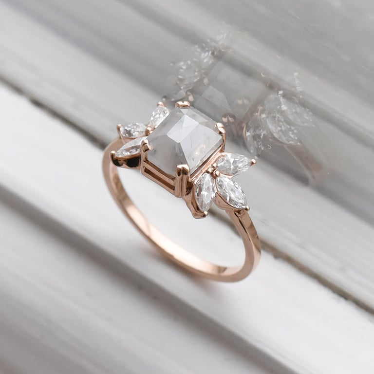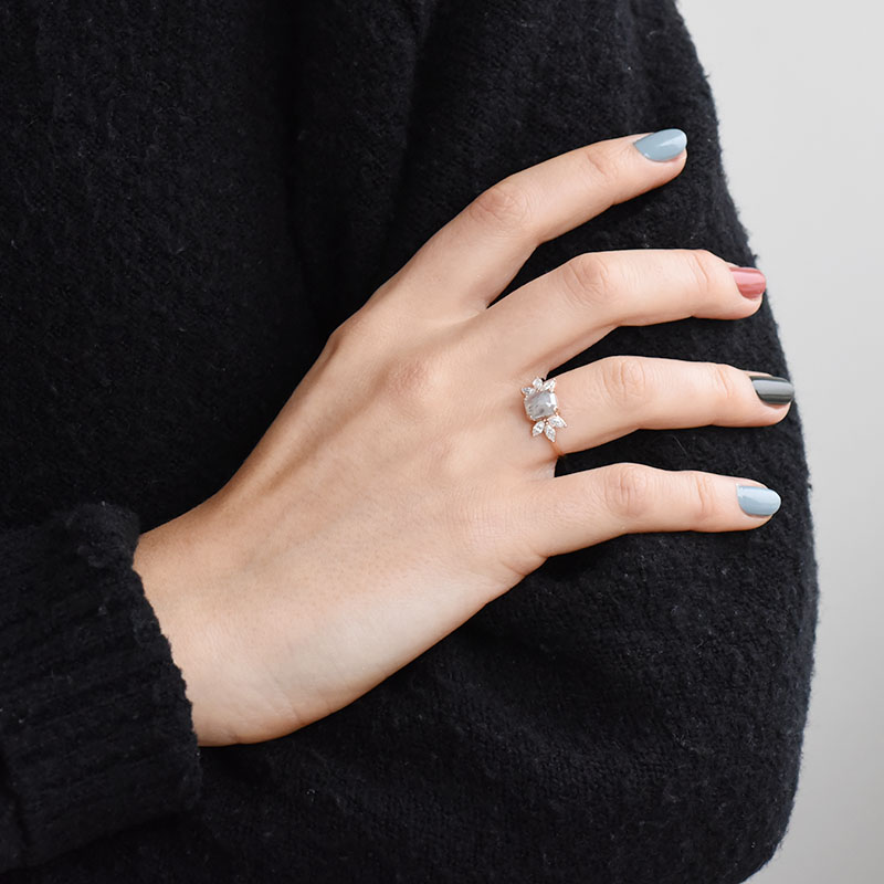 • ein märchenhafter Ring aus recyceltem Gold mit einem Salt and Pepper Diamanten