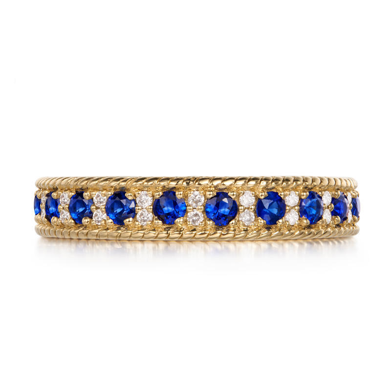 • große blaue Saphire werden von paarweise angeordneten Diamanten und einer verzierten Ringschiene eingerahmt