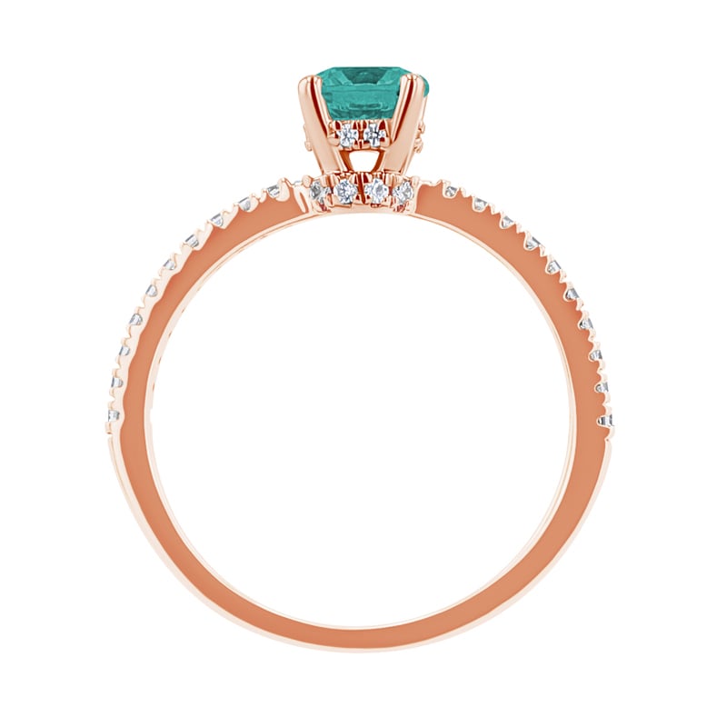 • ein runder grüner Saphir sitzt in vier Krappen, die von Diamantbändern gehalten werden und an eine Krone erinnern