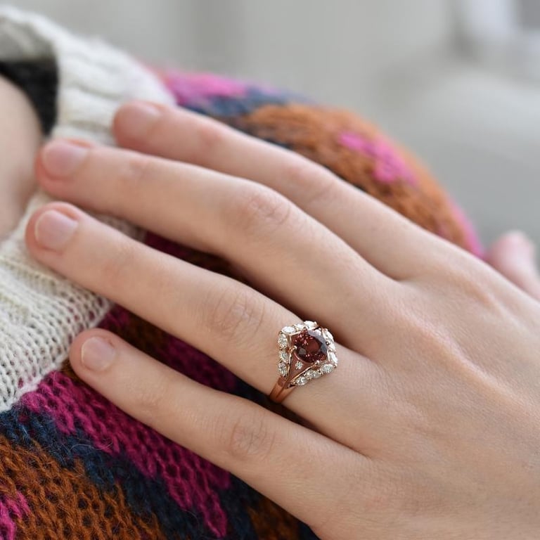 • ein runder dunkelrosa Turmalin in einer Krappenfassung sitzt in einer sich teilenden Ringschiene