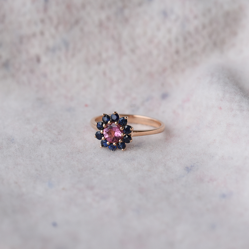• die kleineren blauen Saphire und der mittlere rosa Turmalin bilden eine Blüte, die in Roségold gefasst ist