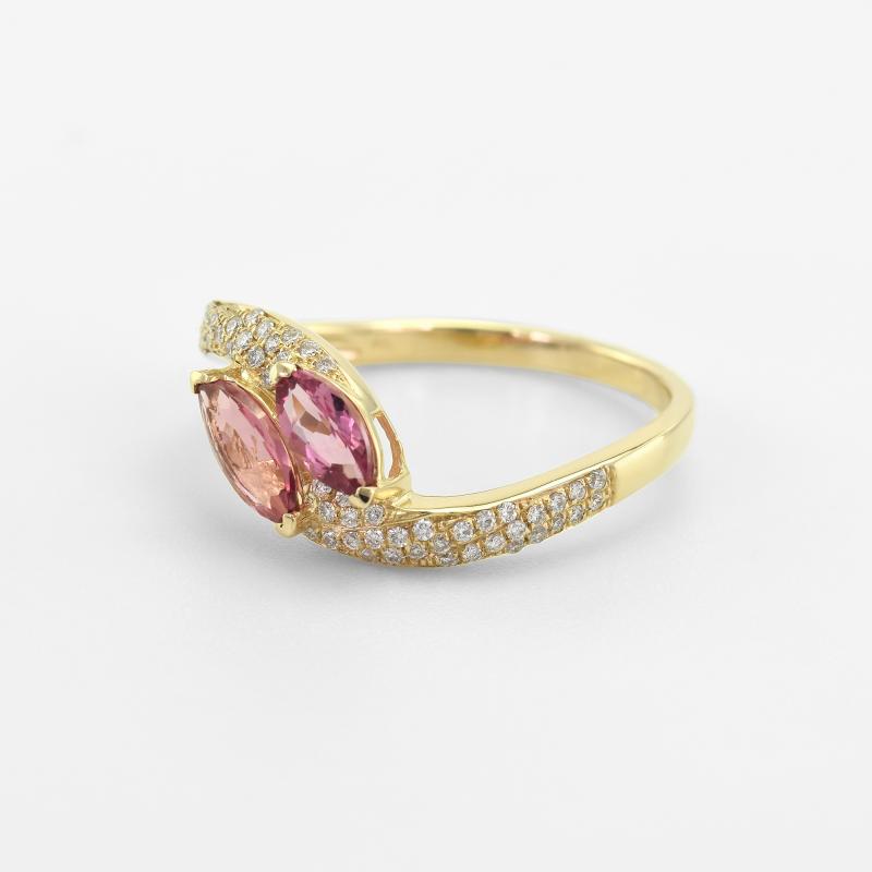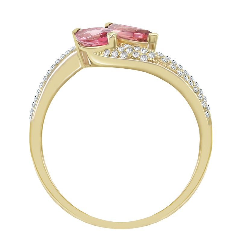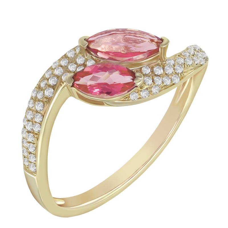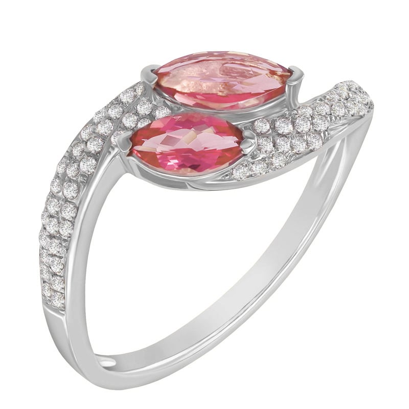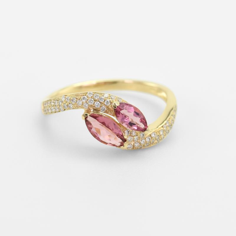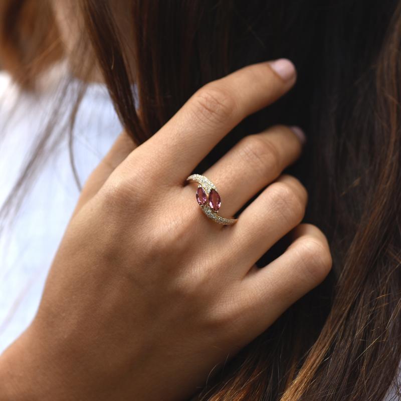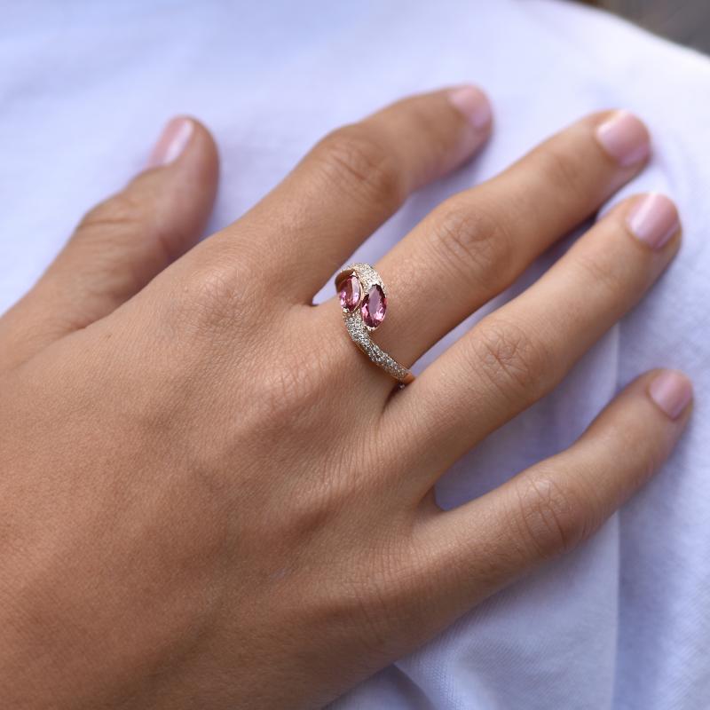 • wundervoller Ring mit geteilter, diamantenbesetzter Ringschiene, an deren Enden sich zwei ovale rosa Turmaline befinden