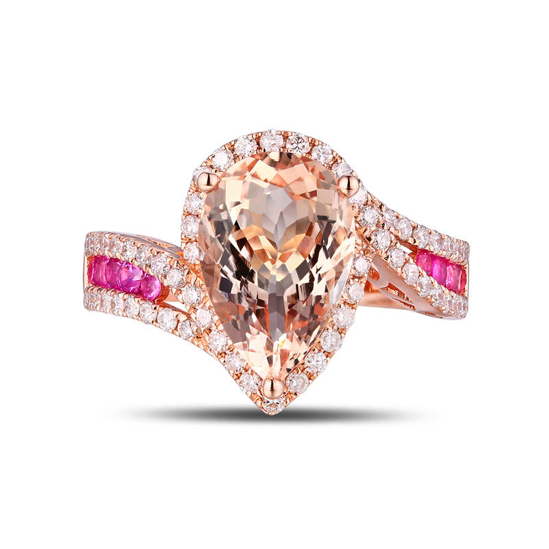 • der tropfenförmige Morganit wird von Gold, Rubinen und Diamanten gekonnt kontrastiert