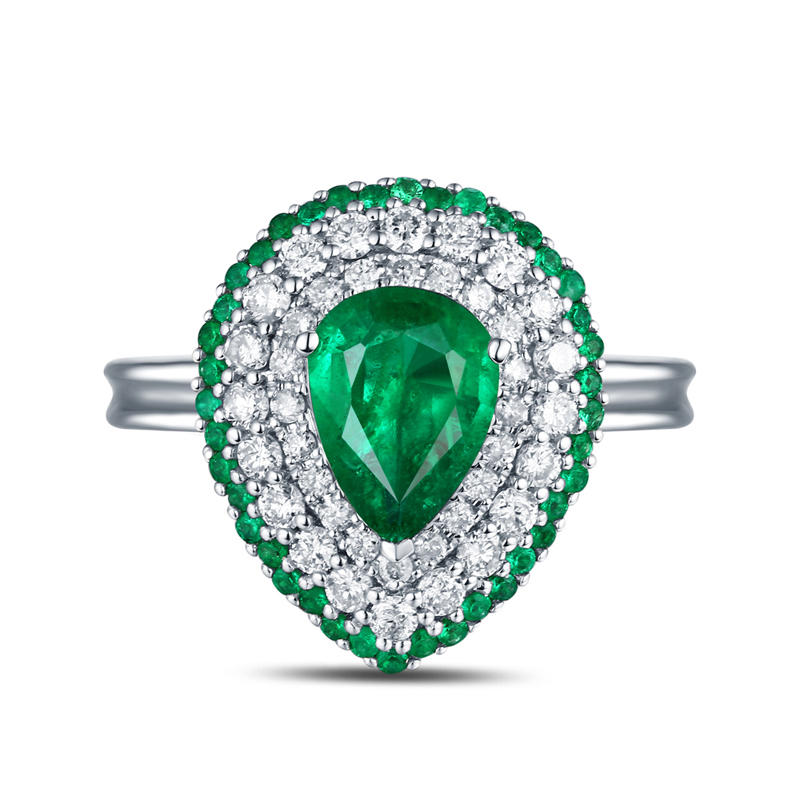• der großen Smaragd in Tropfenform wird von mehreren Halos aus Diamanten und Smaragden umringt und erinnert so leicht an ein Mandala