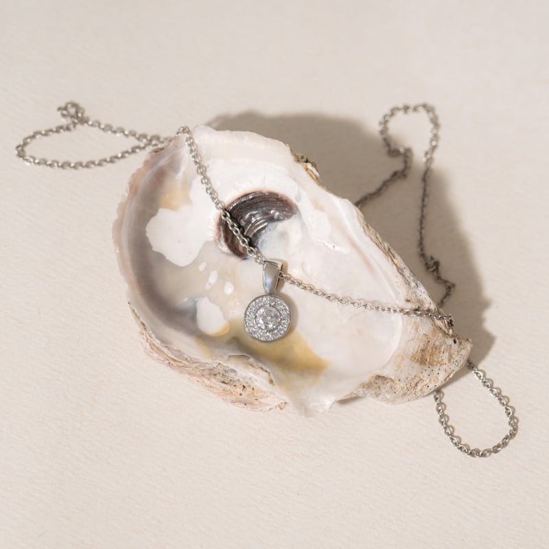 • ein funkelnder Anhänger mit einem Moissaniten in der Mitte, der von 16 glitzernden Diamanten umrahmt wird