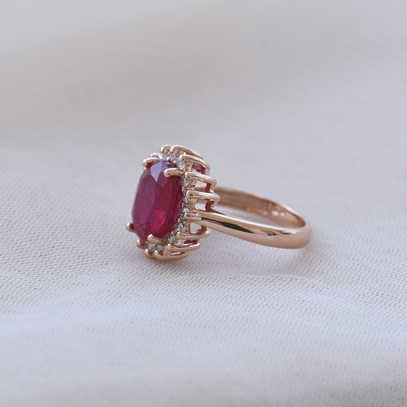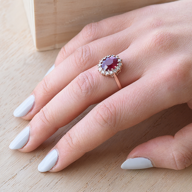 • der Ring mit Rubin, der von Diamanten umgeben ist, wird elegante Outfits perfekt ergänzen