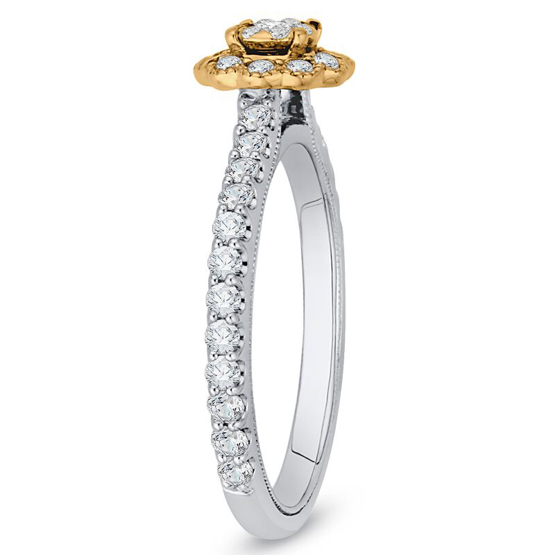 • das Halo in Gelbgold sitzt hier auf einer diamantenbesetzten Ringschiene in Weißgold, aber Sie können den Ring auch in nur einer Goldfarbe Ihrer Wahl erhalten