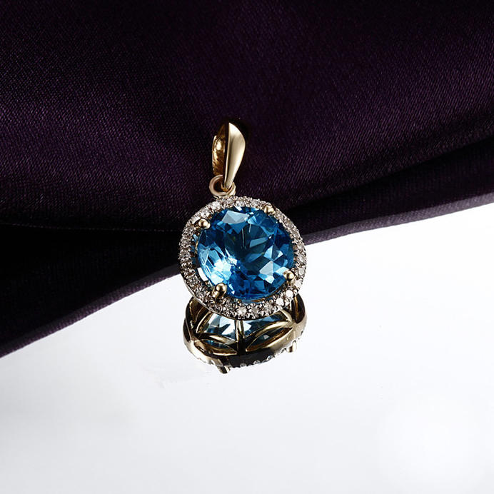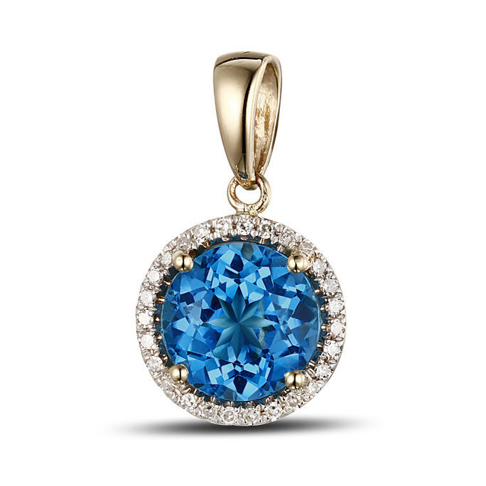 • ein runder himmelblauer Topas in vier Krappen wird von einem Diamantenhalo umrahmt
