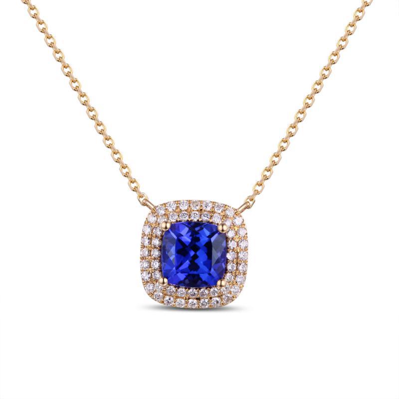 • ein großer Tansanit inmitten eines doppelten Halos aus Diamanten ist der strahlende Mittelpunkt dieser Goldkette