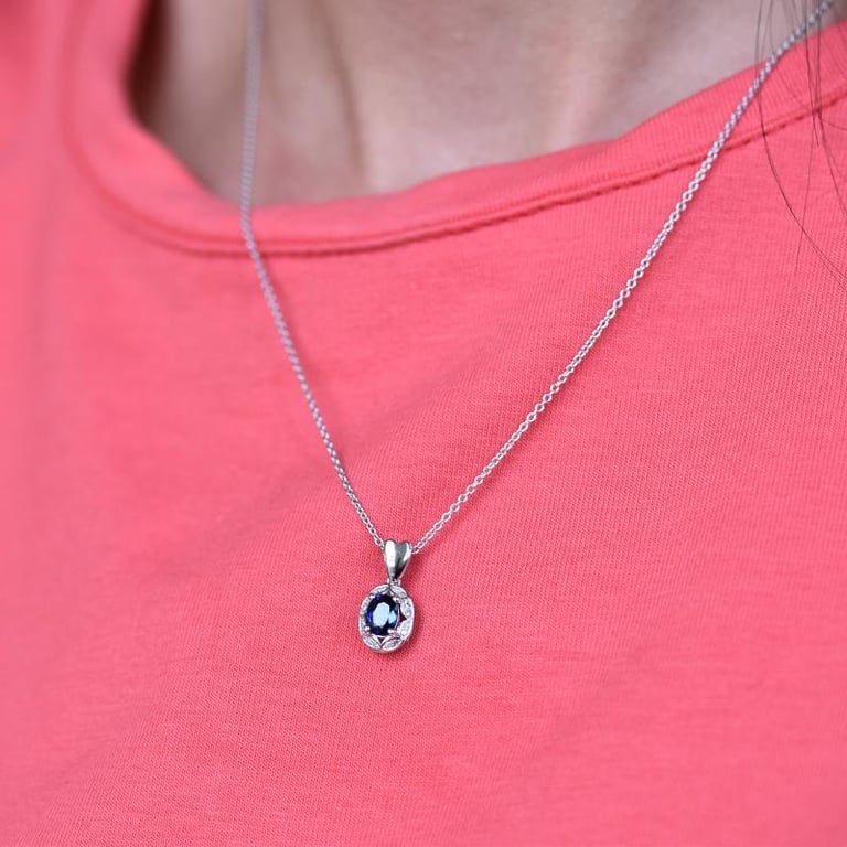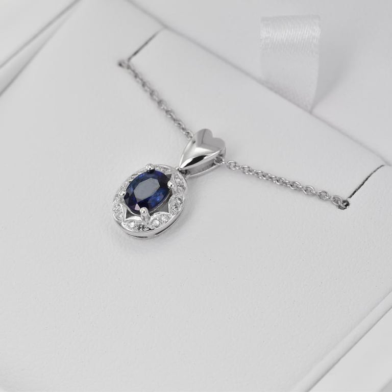• ein ovaler blauer königlicher Saphir in einem raffiniert gestalteten, mit Diamanten besetzten Halo