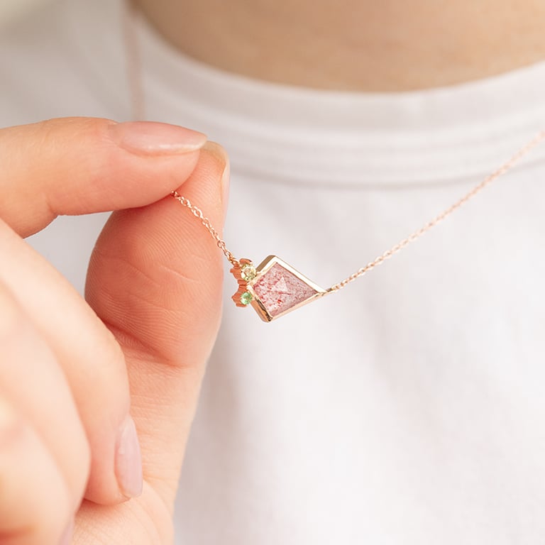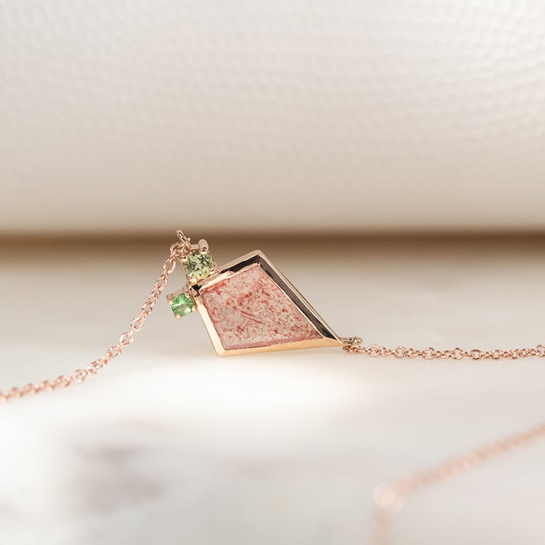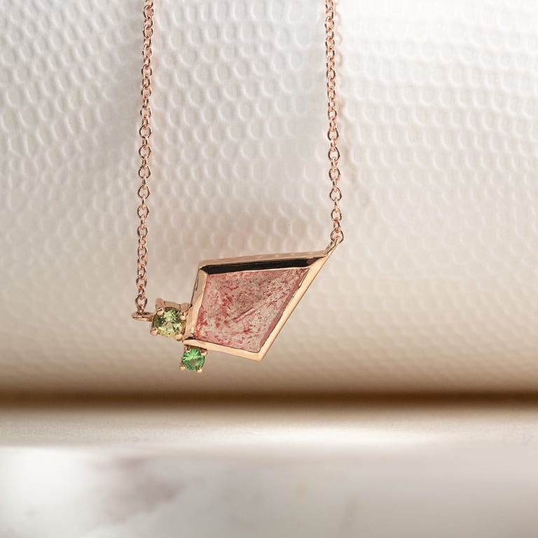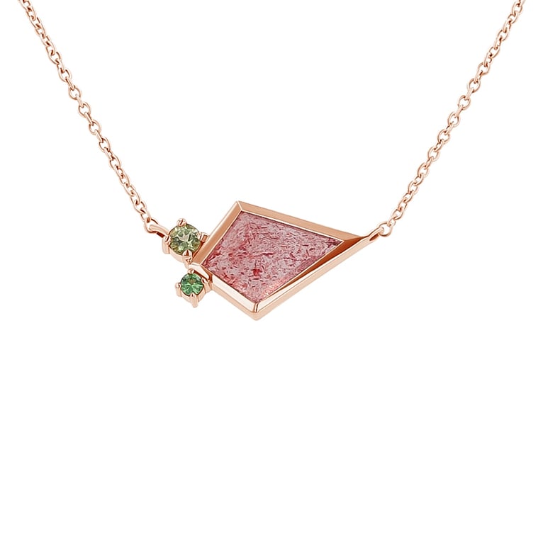 • die Halskette wird von einem erdbeerfarbenen Edelstein in Form eines Drachens (Kite-Form) dominiert