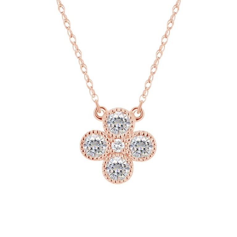 • Halskette mit vier funkelnden Moissaniten, die einen kleinen runden Diamanten umgeben