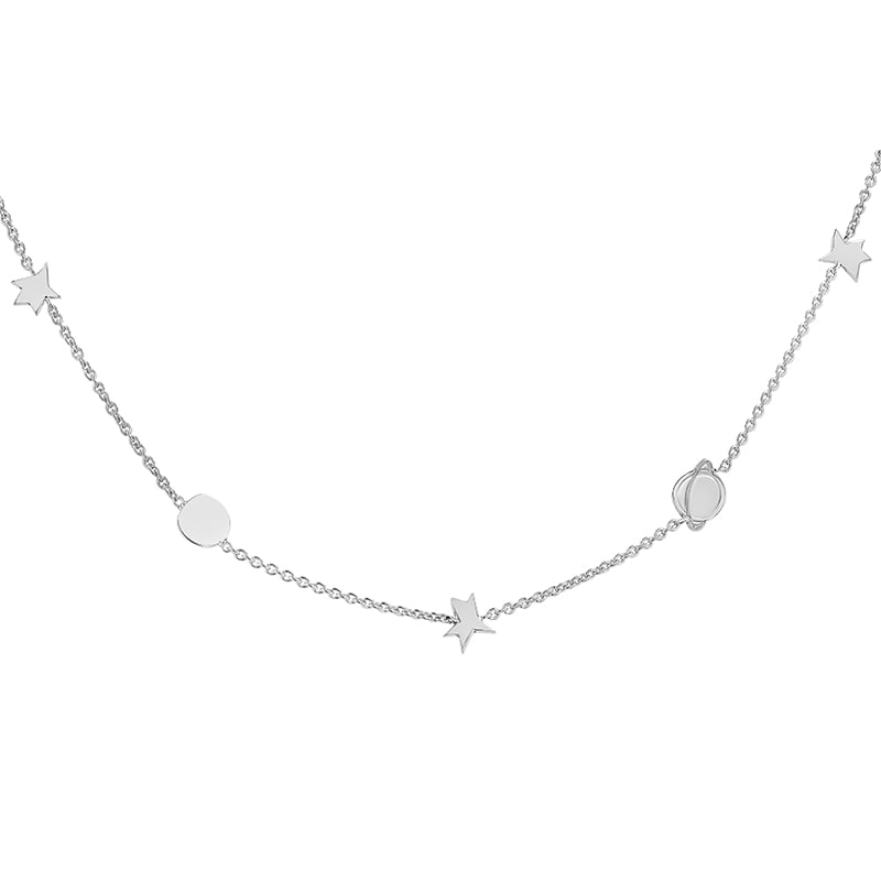 • die zarte Halskette ist mit winzigen, glänzenden Anhängern in Form von Sternen und Planeten besetzt