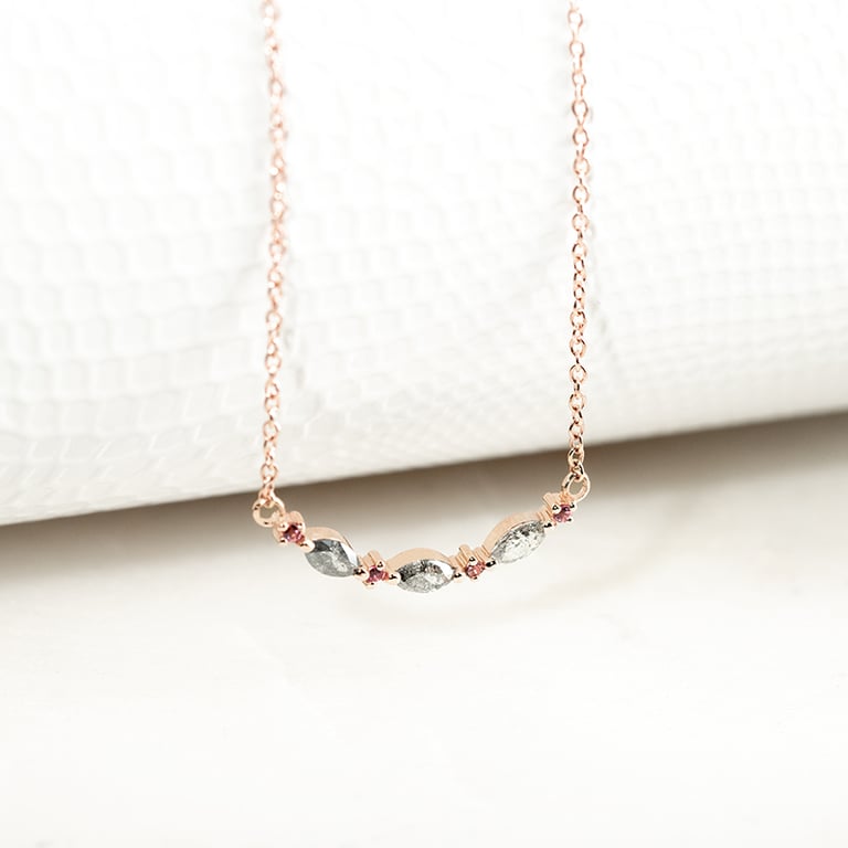 • geschmückt mit einer wunderschönen Kombination aus drei Salt and Pepper Diamanten in Marquise Form und vier rosa Turmalinen