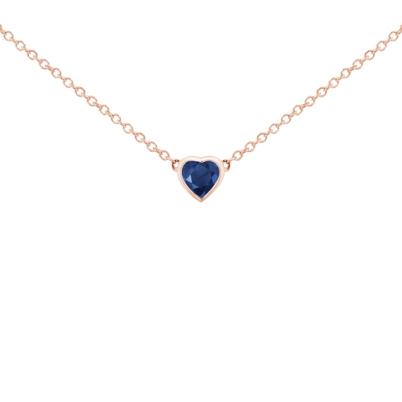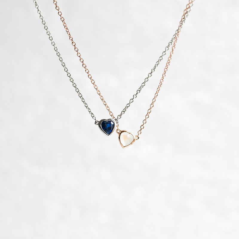 • ein herzförmiger Edelstein in Bezelfassung ist an einer zarten Gold- oder Platinkette befestigt
