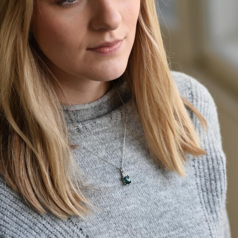 • der Anhänger mit dem kissenförmigen Smaragd in Krappen wird von einem Quadrat und einer Schlaufe gahalten