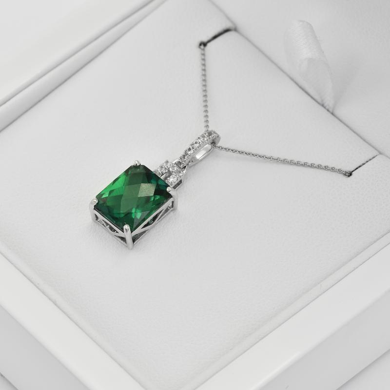 • elegante Weißgold-Kette mit gradlinigem, rechteckigem waldgrünen Smaragd