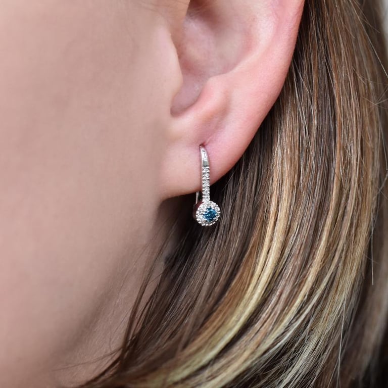 • ein runder blauer Diamant ist von einem funkelnden mit weißen Diamanten besetzten Halo umgeben