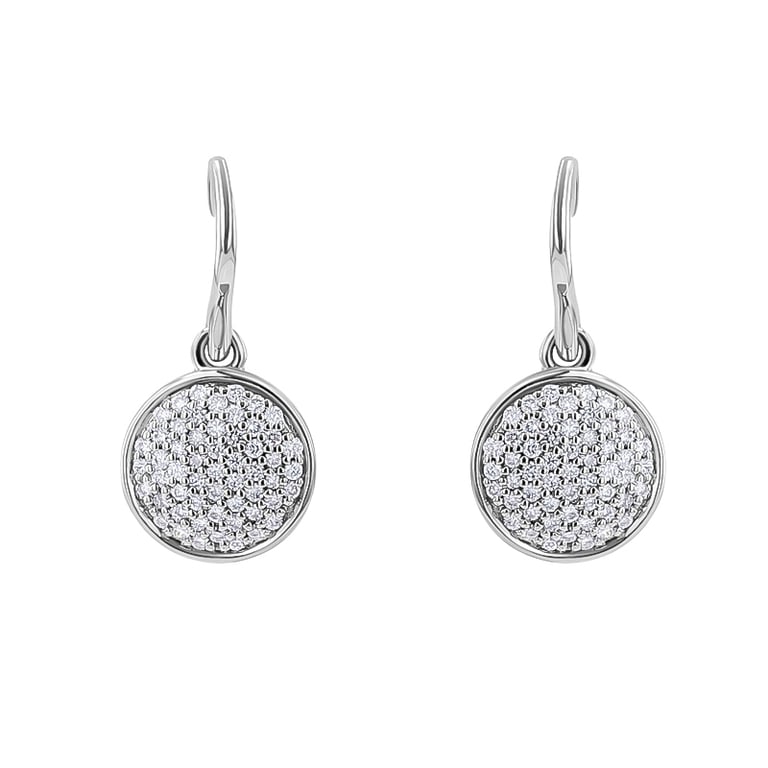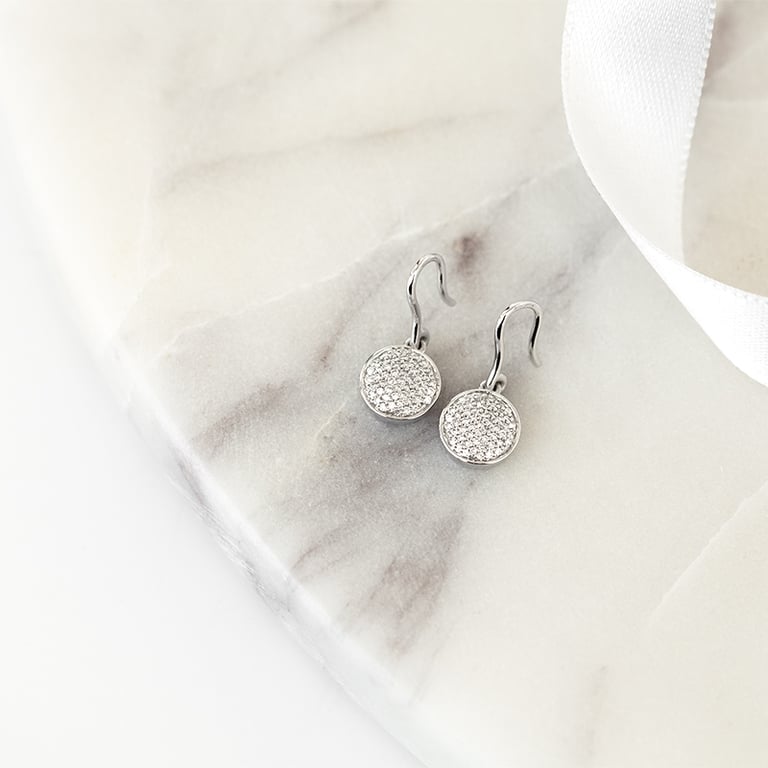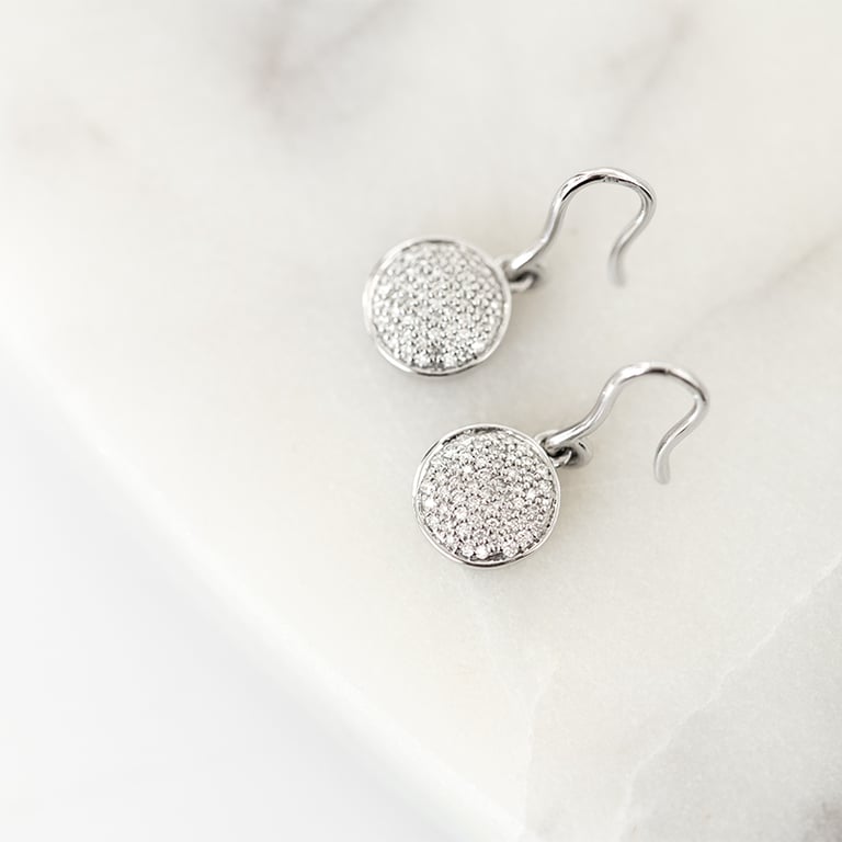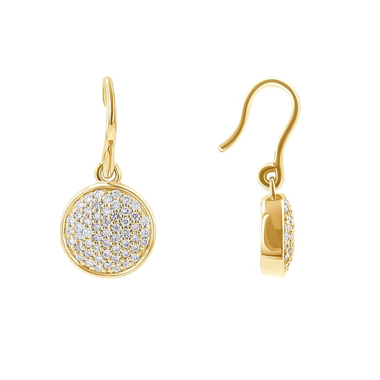 • jeder Ohrring ist mit einer runden Scheibe verziert, die mit funkelnden Lab Grown Diamanten besetzt ist