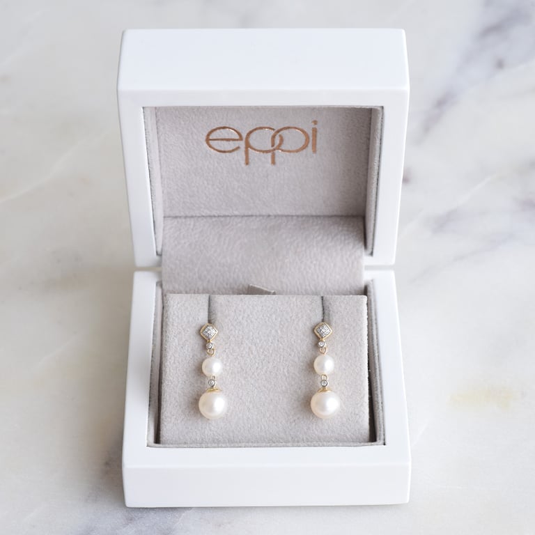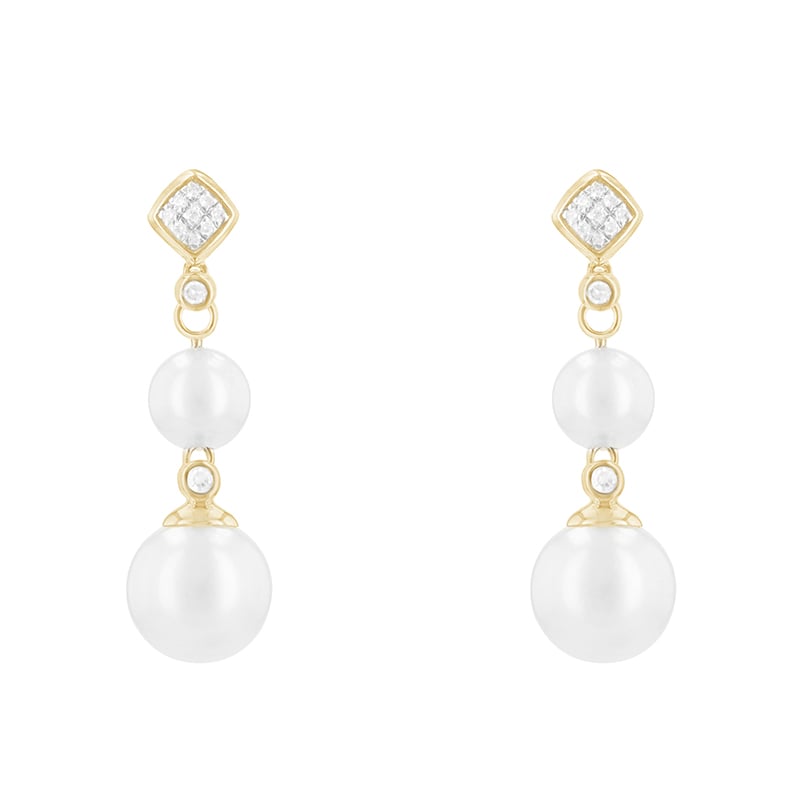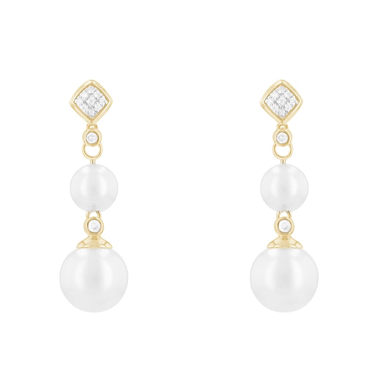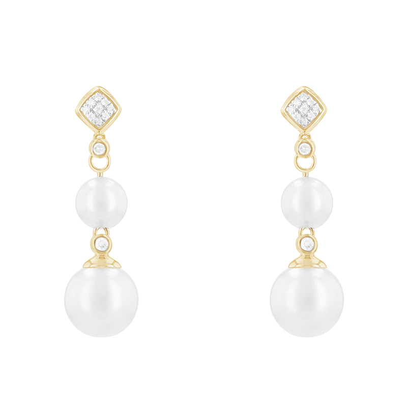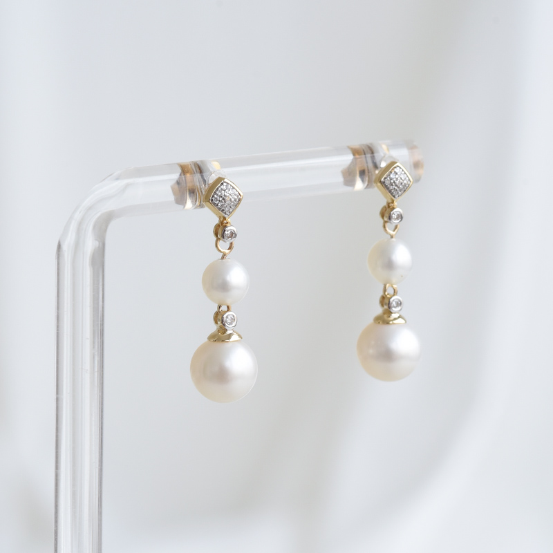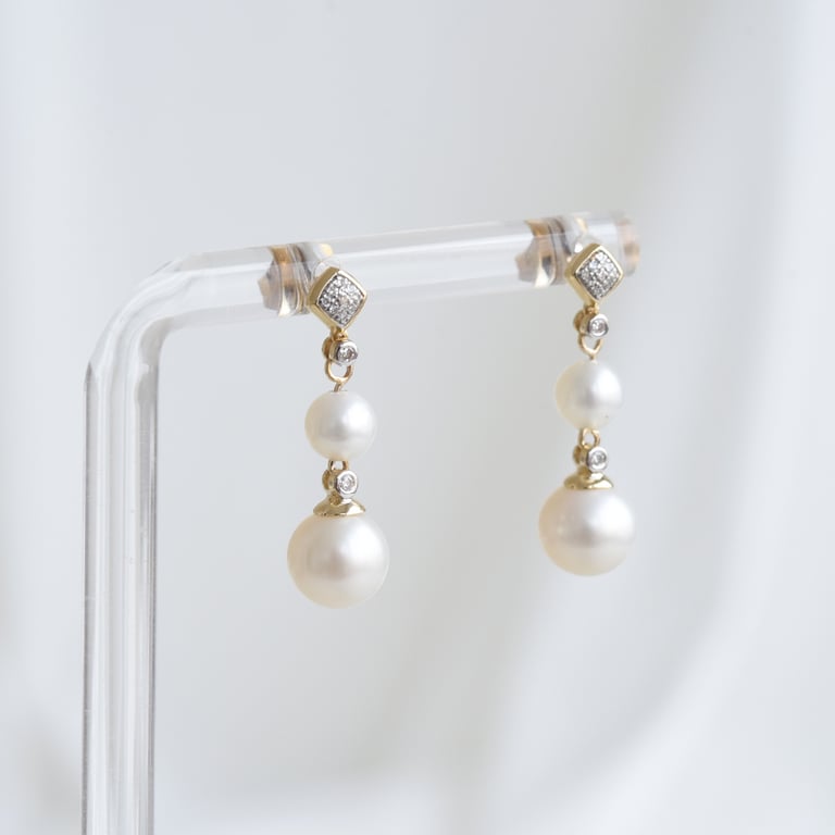 • Hängeohrringe betonen den Glanz der Perlen und die Funken der Diamanten
