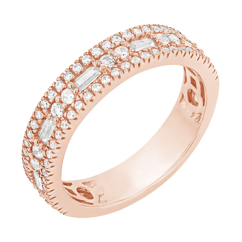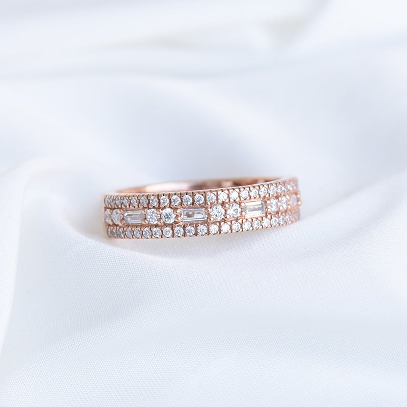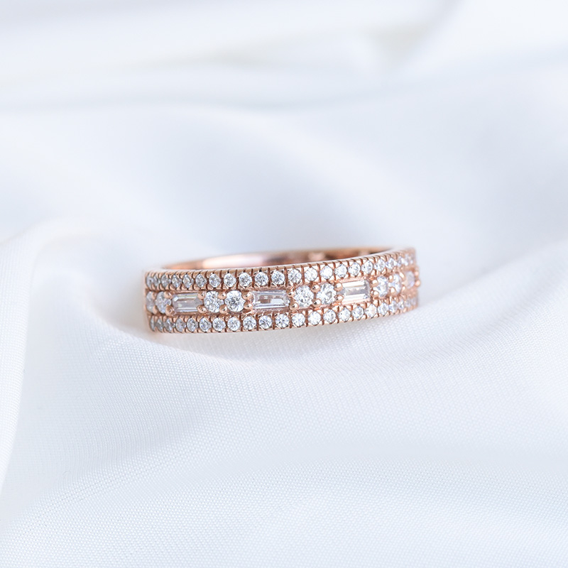 • der Brillantring besteht aus runden Diamanten und Baguettediamanten Laborursprungs