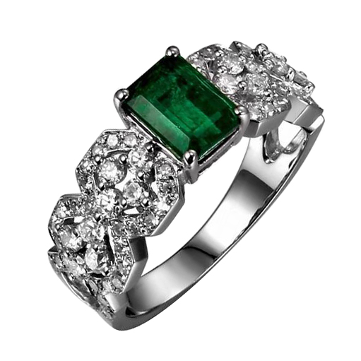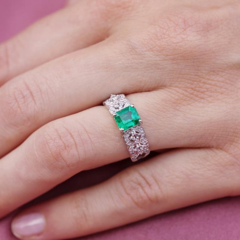 ● ein rechteckiger Smaragd im Emerald-Schliff wird von raffiniert geschmiedeten Verzierungen umgeben, die mit Diamanten besetzt sind