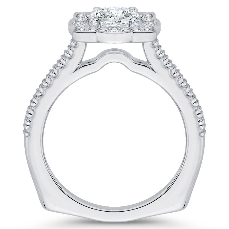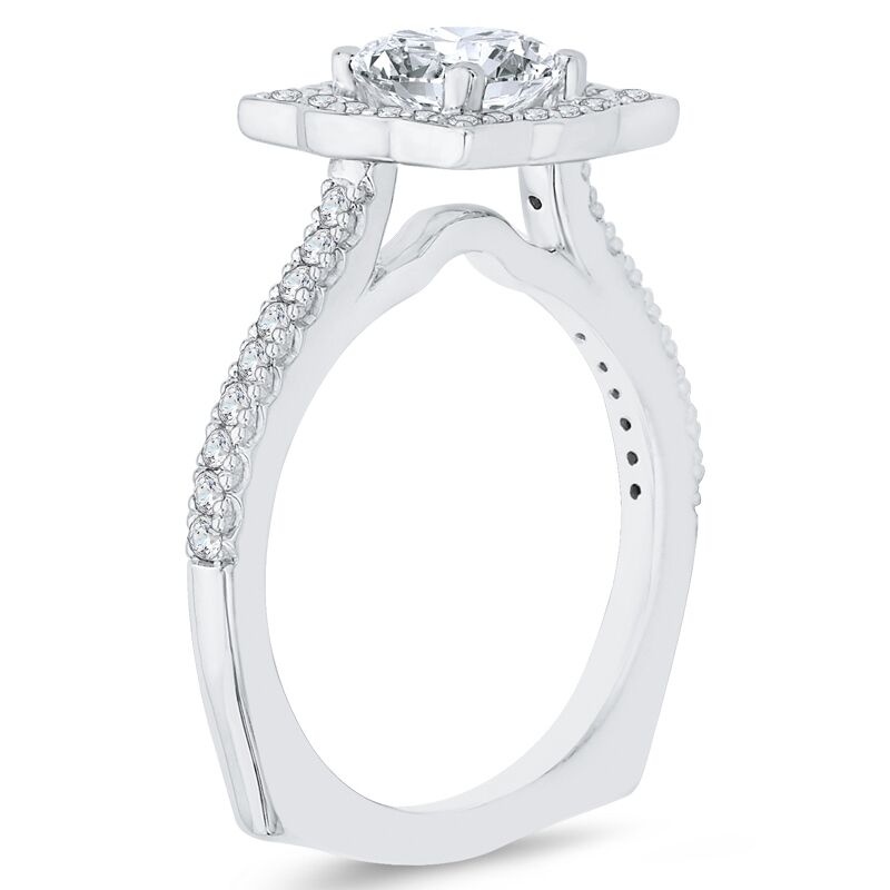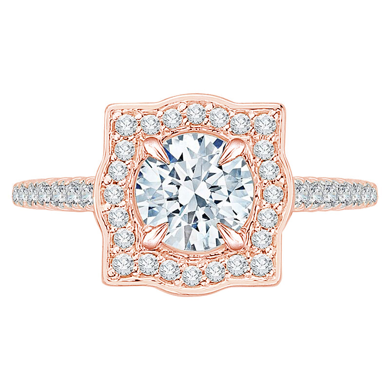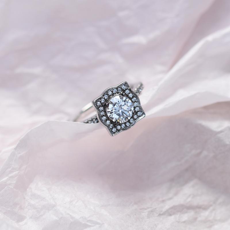 • das Halo aus Diamanten ist eckig und rund zugleich, was modern und klassisch wirkt