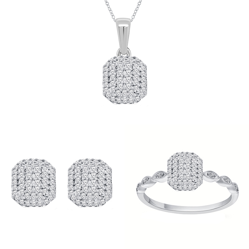 • Schmuckset mit Diamanten bestehend aus Ohrringen, Ring und Anhänger aus Gold oder Platin