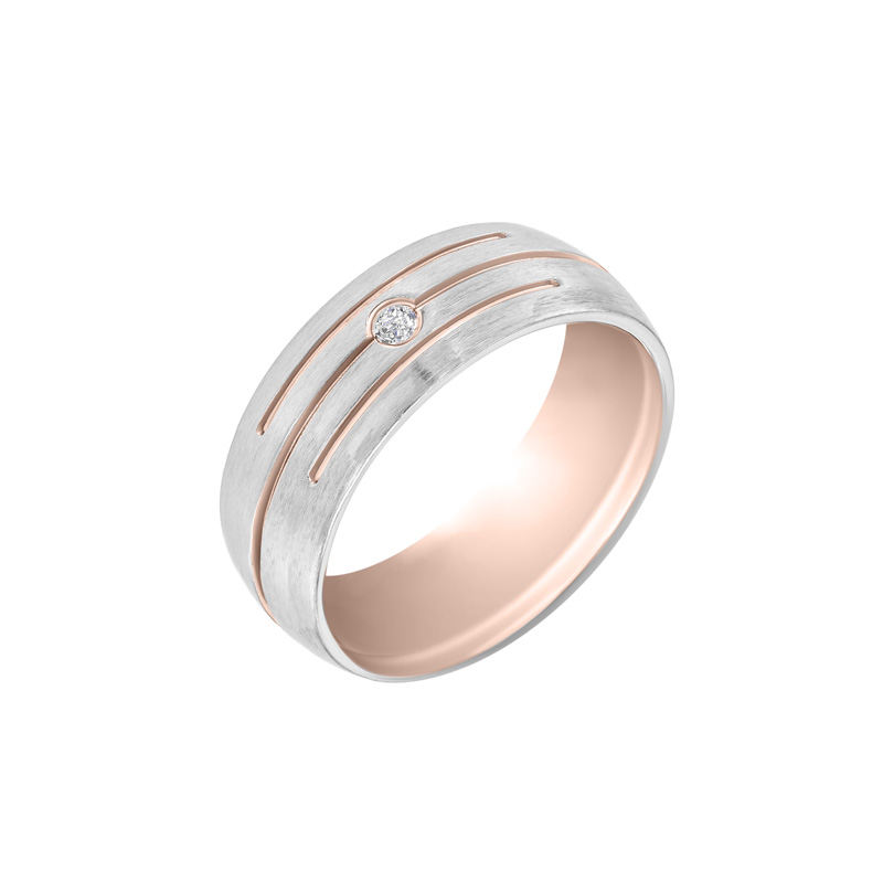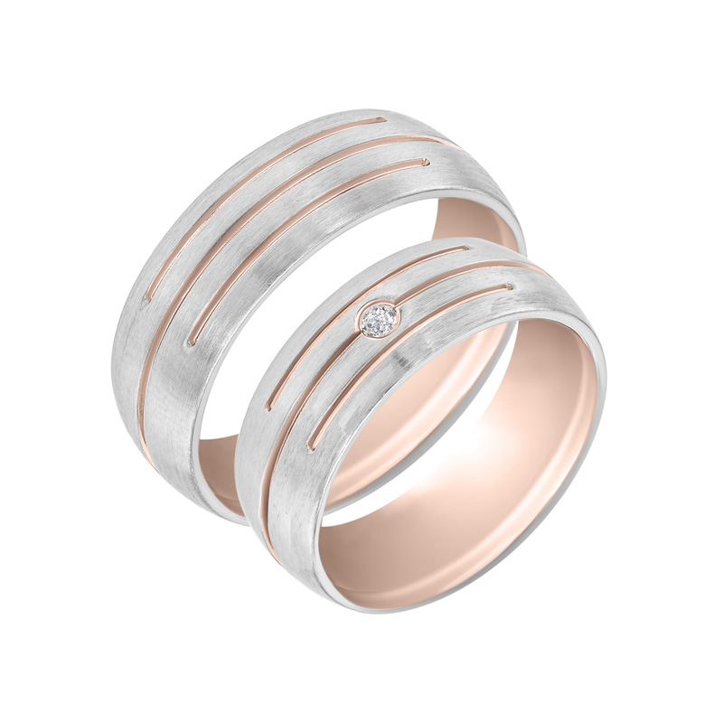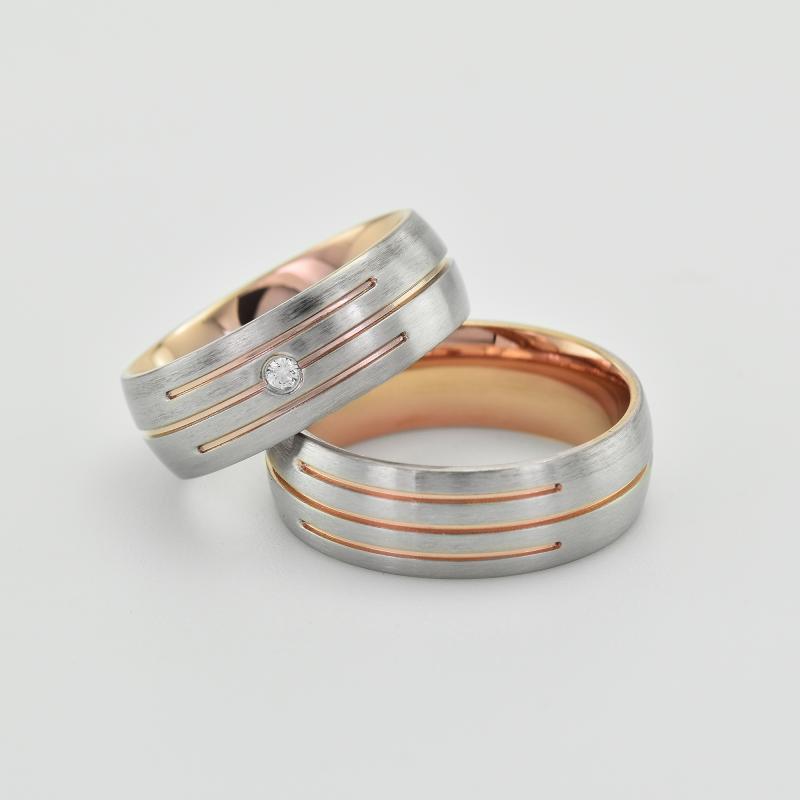 • mattgoldene halbrunde Eheringe mit drei zarten Streifen in andersfarbigem Gold