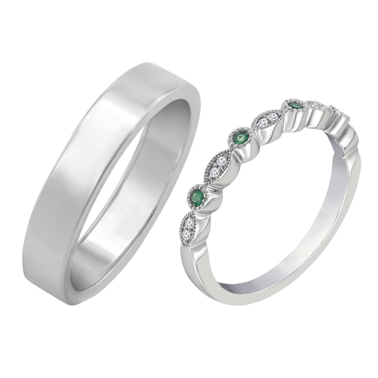 • extravagante Eternity-Eheringe aus Gold mit einem klassischen Ring und einem Ring mit Diamanten und Smaragden