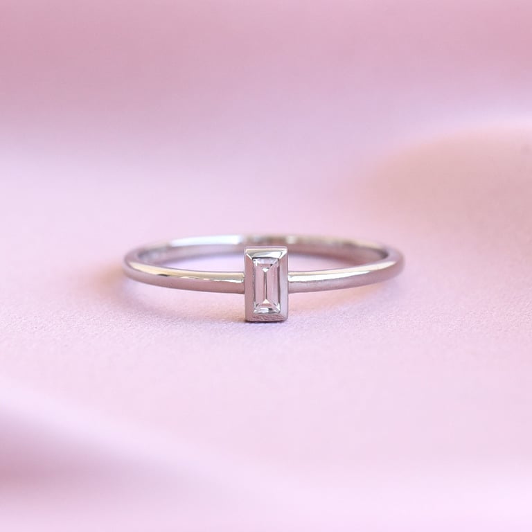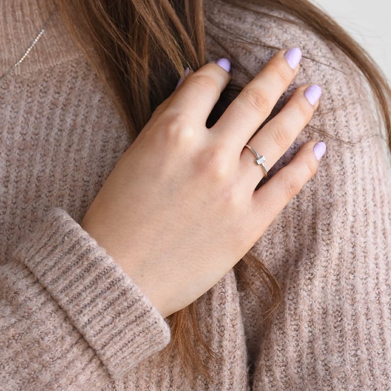 • den minimalistischen Ring ziert ein weißer Saphir in Baguetteform