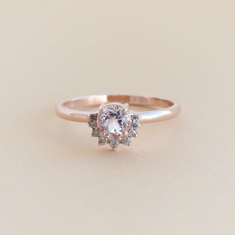 • zarter Ring aus recyceltem Gold mit Edelsteinen in hellrosa und grauen Farbtönen