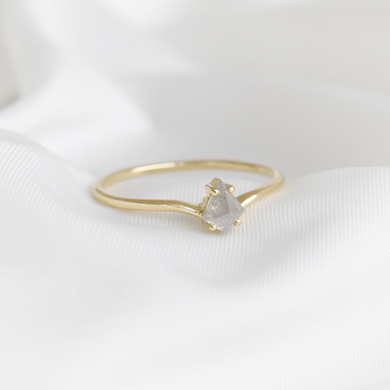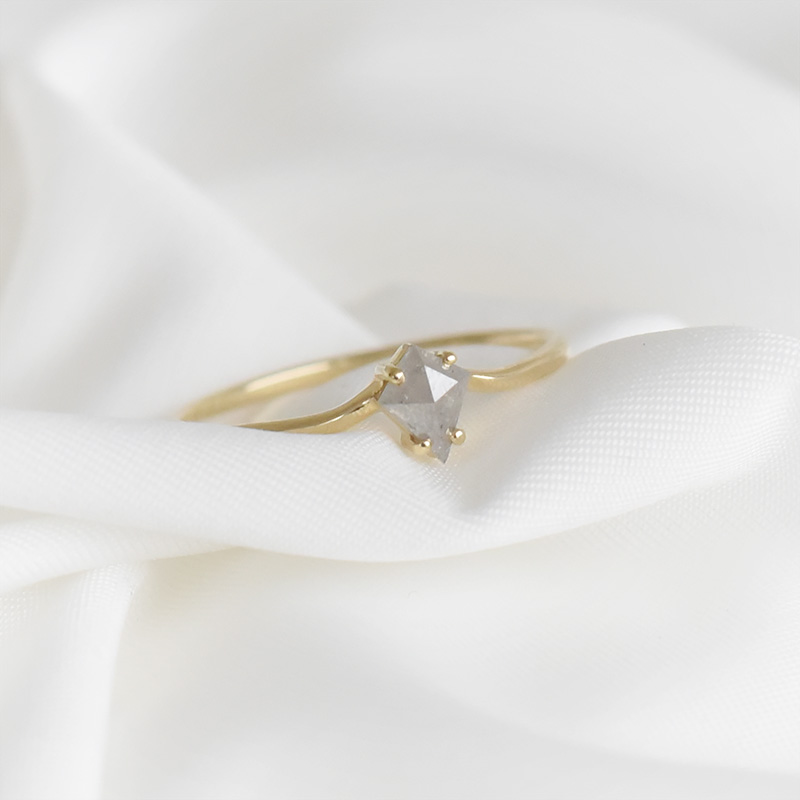 • in diesem Ring in V-Form ruht im V ein hellgrauer Diamant in Kite-Form