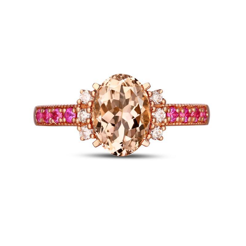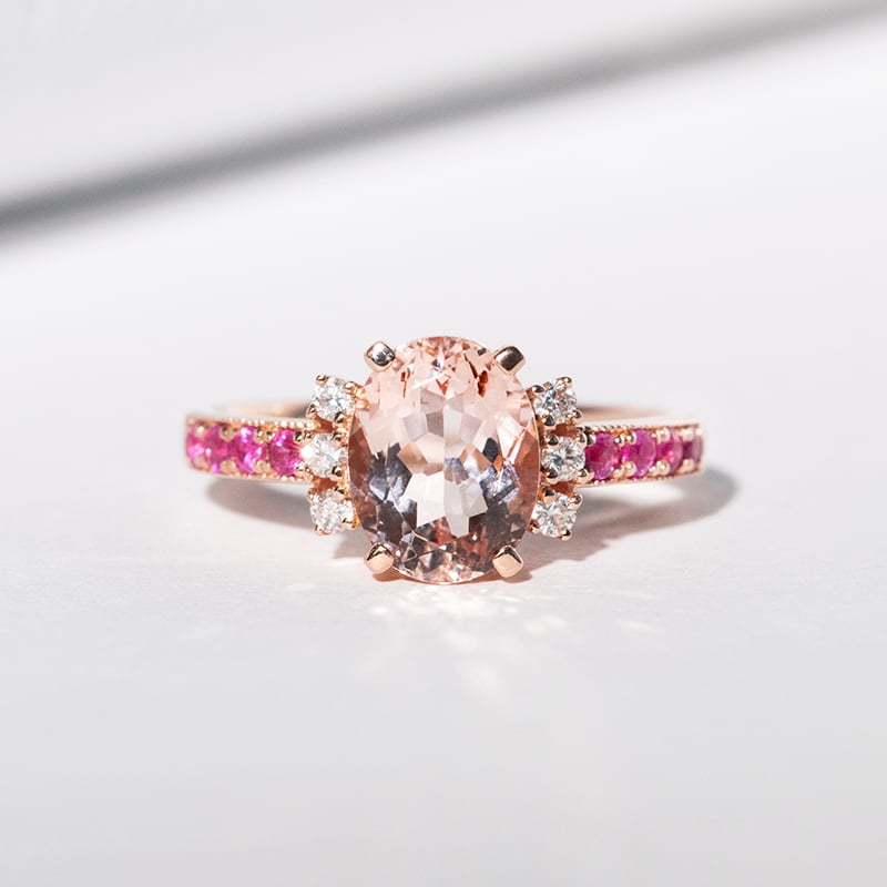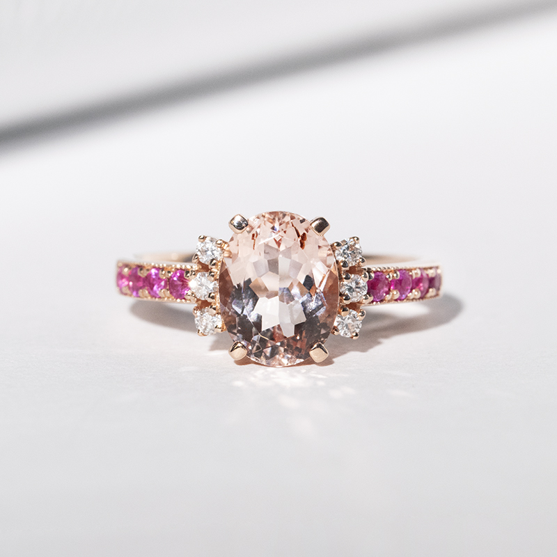 • der Morganit in Peach Farbe ist umgeben von luxuriösen Diamanten