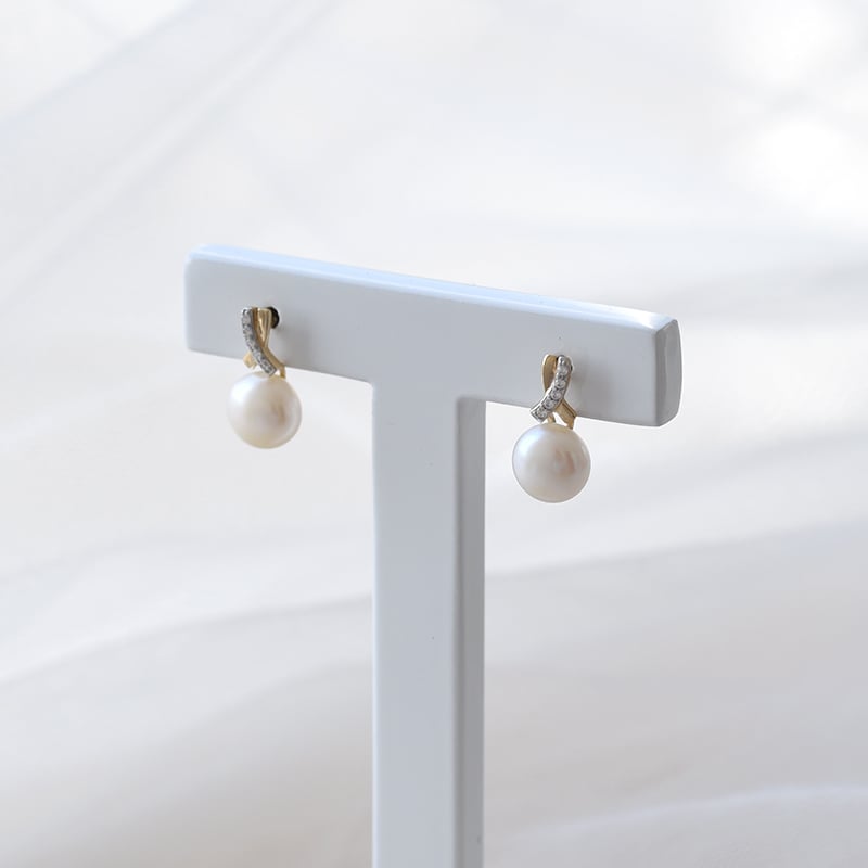 • die Perlen hängen an einer stilisierten Schlaufe, die halbseitig mit Zirkonia besetzt ist