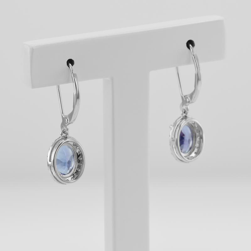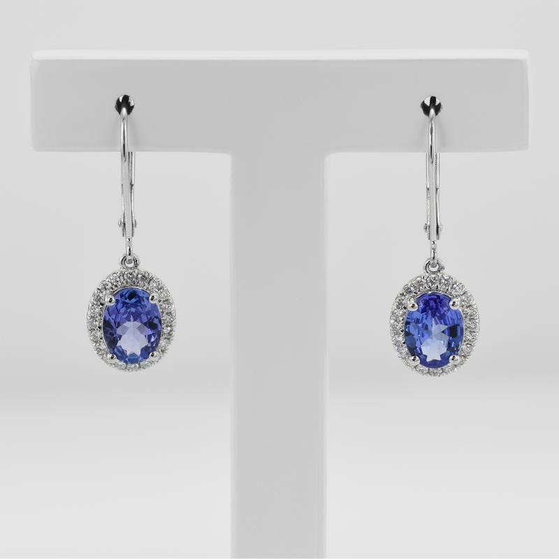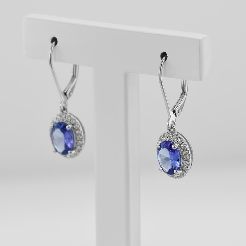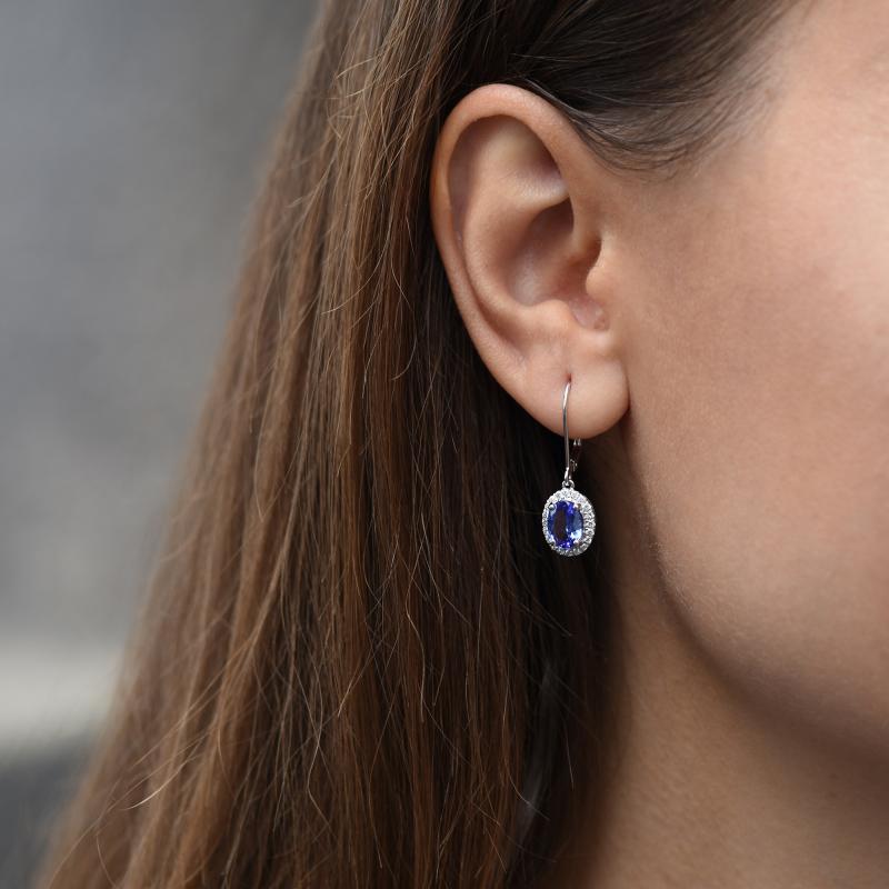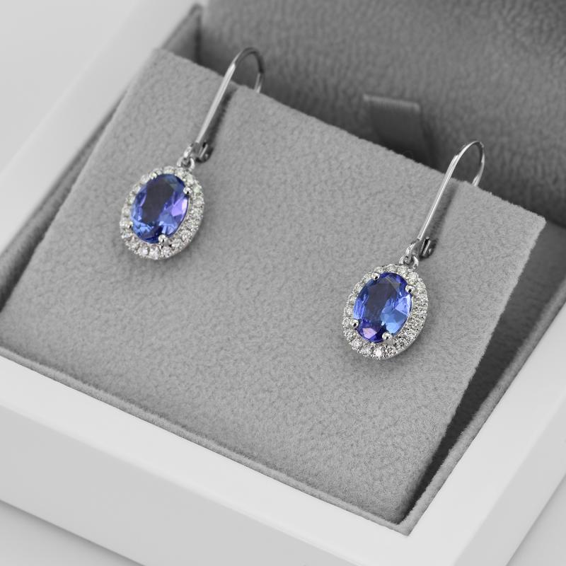 • der zentrale Tansanit von blau-violetter Farbe ist in jedem Ohrring von 20 natürlichen Diamanten umgeben