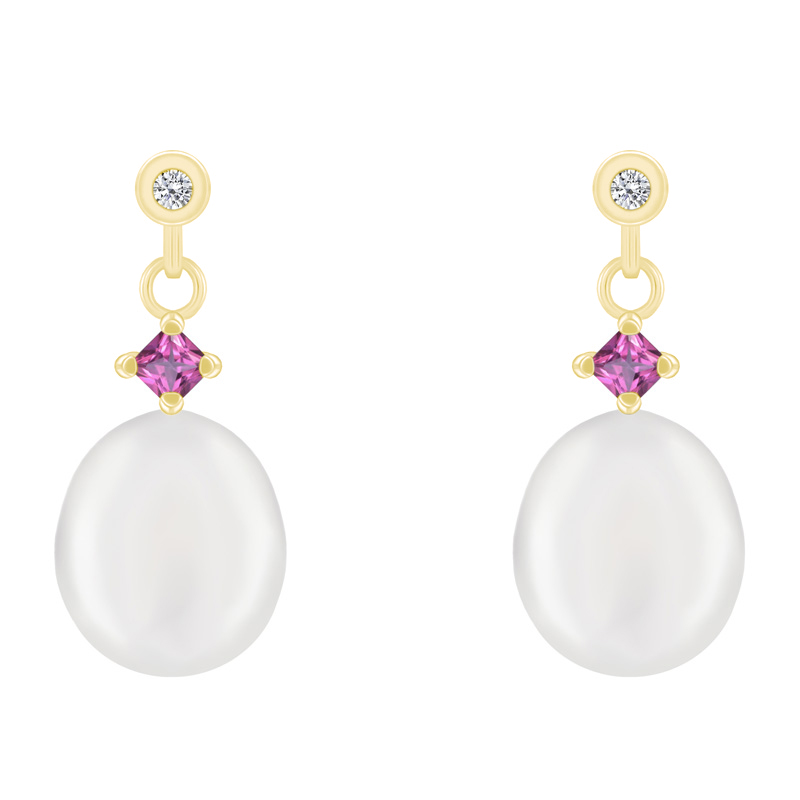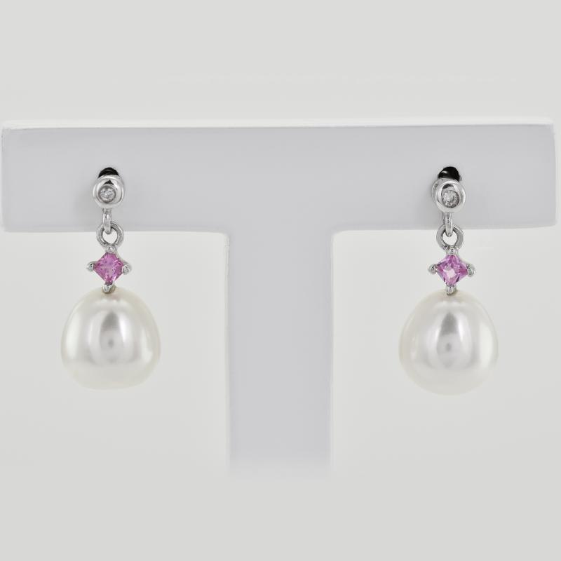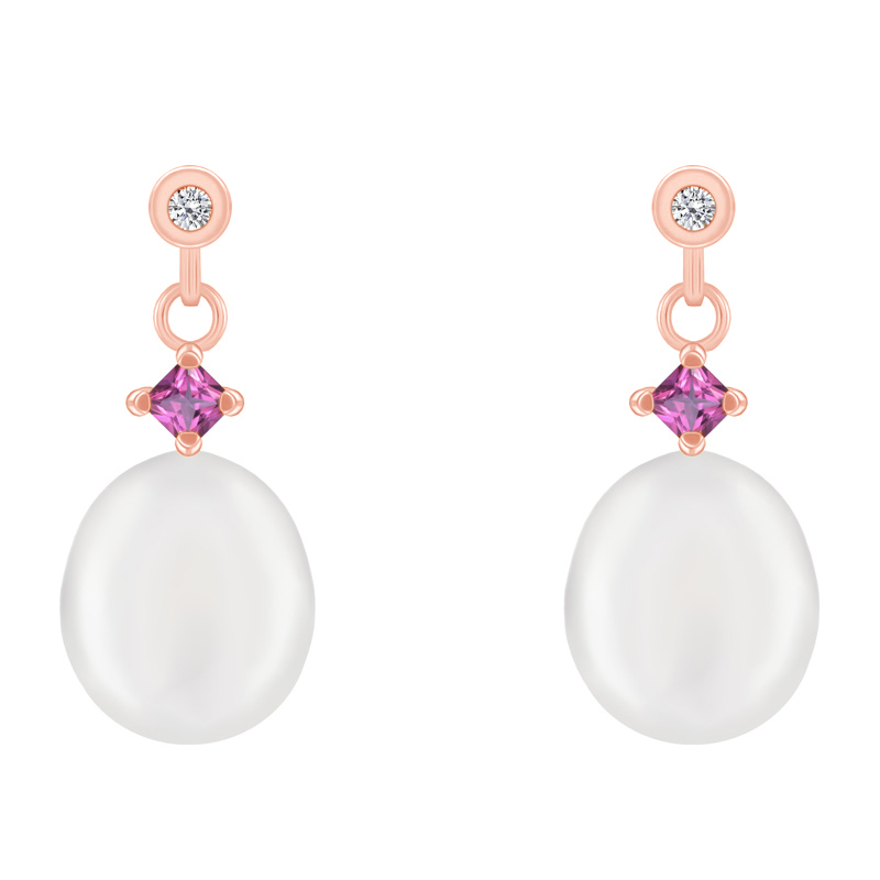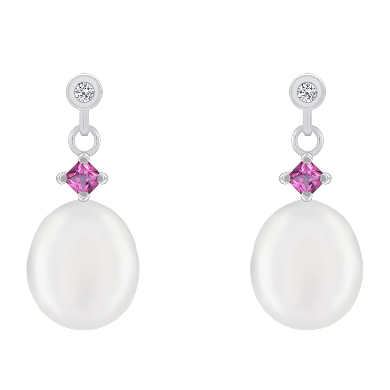 • auf den ovalen weißen Perlen mit einem leichten rosa Schimmer liegt ein kleiner quadratischer rosa Saphir